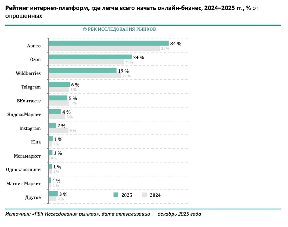 РБК опубликовал результаты исследования о платформах для старта онлайн-бизнеса в России, и второй год подряд лидером рейтинга стал Авито. Опрос проводился в декабре и охватил более тысячи респондентов – действующих предпринимателей и тех, кто только планирует запуск онлайн-продаж. Согласно данным «РБК Исследования рынков», 34% участников считают Авито самой простой площадкой для старта бизнеса в онлайне. Ozon и Wildberries заняли второе и третье места. Респонденты отмечают широкую аудиторию, минимальные стартовые вложения и простую регистрацию. Авито сохраняет первенство не только в общем рейтинге, но и в отдельных категориях. Его одинаково часто называют удобной площадкой как уже действующие предприниматели, так и те, кто только готовится выйти на рынок. Это подтверждает тренд на использование классифайдов как первого шага в e-commerce. Эксперты отмечают, что рынок онлайн-торговли в России постепенно входит в фазу зрелости, потому что предприниматели все чаще ищут каналы, где важны не только цена, но и доверие, репутация и прямая коммуникация с покупателем. [mondiara.com](https://mondiara.com)