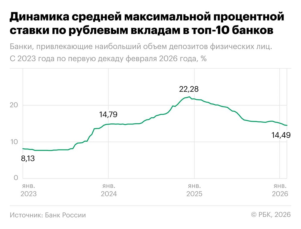 Средняя максимальная ставка по вкладам в топ-10 банков в первой декаде февраля снизилась на 0,08 п. п. и составила 14,49% годовых, сообщает Банк России. Незначительно повысилась доходность вкладов от шести месяцев до одного года — на 0,01 п. п. На остальных сроках прошло снижение в диапазоне 0,04–0,08 п. п.: ✓ на срок до трех месяцев — 13,86% годовых (–0,04 п. п. к третьей декаде января); ✓ на срок от трех до шести месяцев — 14,22% годовых (–0,08 п. п.); ✓ на срок от шести месяцев до одного года — 13,82% годовых (+0,01 п. п.); ✓ на срок свыше одного года — 11,94% годовых (–0,07 п. п.). При расчете средней максимальной ставки ЦБ учитываются срочные банковские вклады, доступные любому клиенту без предварительных условий. [mondiara.com](https://mondiara.com) 👆 Больше новостей и анализа Скачать приложение в [App Store](https://apps.apple.com/ru/app/m-o-n-d-i-a-r-a/id6475953453) Скачать приложение в [Google Play](https://play.google.com/store/apps/details?id=com.mondiara.app) Источник: www.rbc.ru