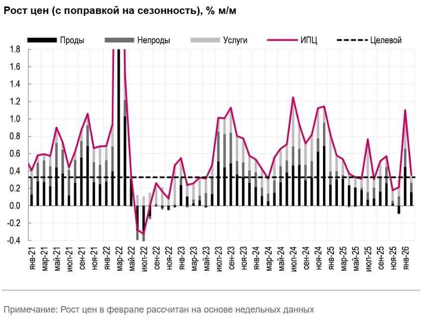 Уже в феврале инфляционное давление нормализуется, что позволит ЦБ продолжить цикл снижения ставки. По итогам 2026 ожидаем инфляцию на уровне 5,4% г/г — Ренессанс Капитал [mondiara.com](https://mondiara.com) 👆 Больше новостей и анализа Скачать приложение в [App Store](https://apps.apple.com/ru/app/m-o-n-d-i-a-r-a/id6475953453) Скачать приложение в [Google Play](https://play.google.com/store/apps/details?id=com.mondiara.app)