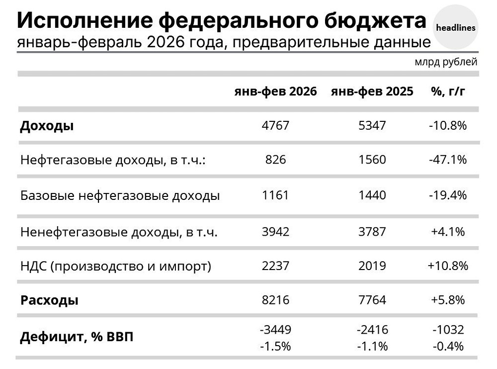 Дефицит бюджета РФ по итогам первых двух месяцев 2026 года составил 3,5 трлн руб. — 1,5% ВВП, что на 0,4% больше, чем за соответствующий период 2025 года. Доходы бюджета в январе-феврале составили 4,8 трлн (-10,8% YoY): нефтегазовые доходы сократились на 47,1% YoY, ненефтегазовые выросли на 4,1% YoY; расходы бюджета составили 8,2 трлн, увеличившись на 5,8% YoY. Минфин связывает такую статистику с тем, что власти в начале года платят за услуги, которые будут выполняться в течение всего года, и утверждает, что она не повлияет на исполнение бюджета на 2026 год. Пост взят с международного финтех-медиа ресурса [M O N D I A R A](https://mondiara.com) ➠ [веб-приложение](https://mondiara.com) ➠ [Скачать](https://apps.apple.com/ru/app/m-o-n-d-i-a-r-a/id6475953453) на iPhone ➠ [Скачать](https://play.google.com/store/apps/details?id=com.mondiara.app) на Android Источник: headlines MACRO