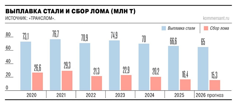 Сбор лома черных металлов может стать минимальным за 17 лет — в 2026 году он может сократиться на 6,7% год к году, до 15,3 млн тонн. В 2025 году показатель сократился до минимума за последние 16 лет. Причина — рост конкуренции с другими видами сырья при сокращении сталелитейного производства. Цены на лом в этих условиях находятся на минимальном уровне, что делает бизнес заготовителей нерентабельным и вынуждает компании массово уходить с рынка.