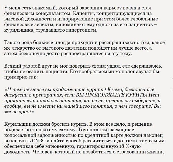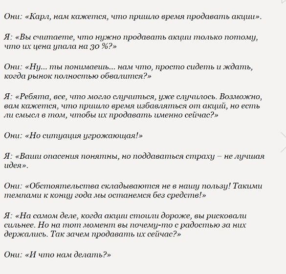 Карл Ричардс | Психология инвестиций Прекрасно написанная (и переведенная без потери смысла) книга про работу с личными финансами и принятие правильных, релевантных вашим личным задачам решений. Не изобилует водой, что радует. Мне особо нравится в ней то, что автор (профессионал фондового рынка и управляющий активами в США) выделяет те же самые вещи, о которых говорю я. И эти же мы мысли вы услышите в интервью очень опытного и крутого профессионала в России (уже сняли, выйдет в первой трети апреля, я репостну). Мы можем перестать питаться иллюзиями. Мы не достигнем цели, пытаясь переиграть рынок, выбрать наилучшие инструменты или разработать совершенные, «пуленепробиваемые» финансовые планы. На самом деле это путь к большим неприятностям. Мы можем защитить себя – до определенной степени. Риск – это то, что остается в сухом остатке, когда вы полагаете, что все продумали. Наши рассуждения о будущем практически всегда неверны. Предугадать все не удастся, но чтобы защитить себя от неизбежных жизненных сюрпризов, можно сделать ряд обдуманных шагов. И про перекладывание ответственности тоже есть. У нас тоже были клиенты, которые сначала радостно зарабатывали сотни процентов на нашей аналитике, считая, что это их гениальность, а после крупных потерь на кризисе СВО с их жадной торговлей с плечами резко переложили ответственность на нас (в такие моменты мы думаем, что берем за работу малые деньги, если сравнивать с рынком США, и чеки надо увеличивать кратно). И так бывает везде и всегда, не только в инвестициях. Когда инвестиции эффективны, мы рады себя похвалить: «Я поставил на победителя». Конечно, когда дела идут хорошо, приятно приписывать себе все заслуги. Но если наши вложения стали убыточными, то это непременно чья-то вина. Мы обвиняем того, кто убедил нас в необходимости этого вложения, обвиняем жуликов-банкиров, которые разрушили экономику, неконтролируемые государственные расходы, лживые средства массовой информации, плохую погоду в Бразилии – подойдет любой козел отпущения. Финансовые продукты, включая банковские счета и страховые полисы, равно как и инвестиции, должны рассматриваться с позиции их эффективности при достижении заявленных целей. А поскольку они у каждого человека индивидуальны, то, что подойдет одному, вероятнее всего, навредит другому. Кроме того, выбираемые вами конкретные акции, вероятнее всего, не смогут придать определенности вашим финансовым перспективам. Я часто встречаю людей, которые тратят уйму времени на поиск идеальных инвестиций, игнорируя при этом более значимые аспекты своего финансового положения. И отмечу, что особо уделено внимание вопросам личных финансовых целей и связи счастья с финансами. Короче говоря, в книге реально охвачена вся проблематика того рассадника тараканов, что есть в головах у людей, когда речь идет о финансах и инвестициях. Кому эта книга будет полезна: Широкий круг читателей – буквально каждый, кто что-то сберегает и инвестирует. А уже профессионалам этой отрасли она прям точно зайдет, да еще и станет опорой в работе с клиентами, у которых каша вместо целей и хаос вместо логики. Источник: Igor_Shimko
