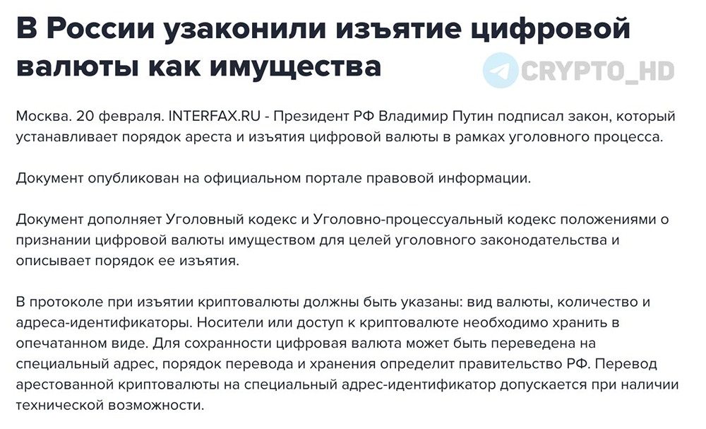 ❗️Президент РФ Владимир Путин подписал закон об изъятии криптовалюты в рамках уголовных дел. Пост взят с международного сервиса для инвесторов и трейдеров [M O N D I A R A](https://mondiara.com) [Скачать](https://apps.apple.com/ru/app/m-o-n-d-i-a-r-a/id6475953453) приложение в App Store [Скачать](https://play.google.com/store/apps/details?id=com.mondiara.app) приложение в Google Play