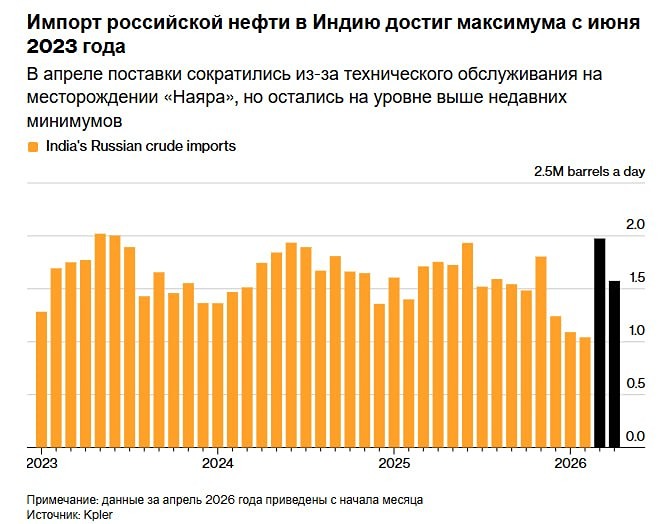 ⚡️ Индия наращивает закупки российской нефти на фоне ослабления санкционного давления, — Bloomberg.