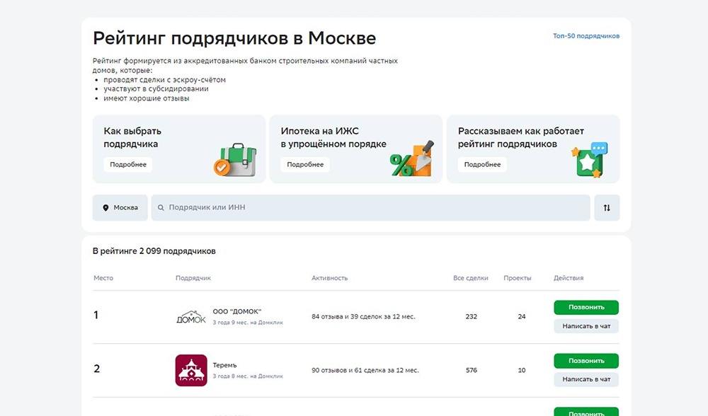 «Домклик» запустил рейтинг надежных подрядчиков в ИЖС Его можно найти в разделе [«Построить дом»](https://domclick.ru/stroitelstvo-domov/katalog-podriadchikov/top). Рейтинг учитывает информацию об аккредитации банком, опыт подрядчика в сделках, результаты работ, актуальность проектов и отзывы клиентов. Из фишек — прямо на сайте можно посмотреть видеообзоры построенных домов. 🔥 Кстати, теперь можно бесплатно узнать информацию из Росреестра и о готовых загородных домах, выставленных на продажу: 🔢Характеристики: площадь дома, кадастровая стоимость дома и участка. 🔢Категорию земель и вид разрешенного пользования. Все объявления, прошедшие проверку, помечают на сайте бейджем «Проверено в Росреестре». ☝🏻 В общем, теперь купить дом станет проще. Не придется тратить время на проверку объекта или подрядчиков для строительства. Источник: https://t.me/if_estate*