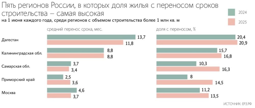 Почему застройщики злоупотребляют мораторием и переносят сроки сдачи? Мораторий на неустойки продлен до конца 2025 года, и, как сказал замглавы Минстроя Никита Стасишин, это в последний раз — больше продлевать не будут. Как мы уже писали, официальная цель моратория (не допустить срыв сроков) провалилась. По данным ЕРЗ, за год доля проектов с просрочками выросла с 8,4 до 10%, пишут «Ведомости». В чем причины: 1️⃣ Нехватка средств на эскроу. Счета раскрываются при вводе в эксплуатацию, с их помощью застройщик должен погасить кредит. 2️⃣ Нежелание банков давать льготную ипотеку на сданные дома. Им выгоднее поддерживать застройщика на этапе стройки, чтобы тот своевременно погасил кредит. А когда дом сдан и кредит закрыт — что там будет с непроданными остатками, уже не так важно. 3️⃣ Дефицит рабочих из-за больших объемов строительства и ужесточения миграционных правил. Т. е. застройщик просто не успевает достроить вовремя. 4️⃣ Необходимость платить налоги и коммуналку после сдачи дома. В том числе за непроданное жилье. 5️⃣Мораторий на штрафы. Если официально разрешают задержать ввод, почему бы и нет. Средний срок просрочек по стране — 3,6 месяца, что в целом привычно для опытных дольщиков. Но в отдельных регионах и ЖК все очень по-разному. Региональный лидер по просрочкам — Дагестан (21% проектов, в среднем на год). Эксперты объясняют тем, что республика только сейчас переходит на долевое строительство и процессы еще не отлажены. В отдаленных регионах (Калининградская обл., Приморский и Хабаровский край) — проблемы с логистикой и особенно острая нехватка рабочей силы. В Самарской области — локальное охлаждение рынка. Источник: Недвижимость