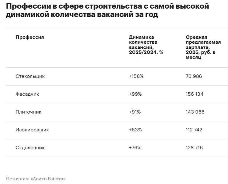 Количество вакансий в сфере строительства в 2025 году выросло на 73% г/г — РБК-Недвижимость со ссылкой на Авито Не является индивидуальной инвестиционной рекомендацией [mondiara.com](https://mondiara.com) 👆 Больше новостей и анализа Скачать приложение в [App Store](https://apps.apple.com/ru/app/m-o-n-d-i-a-r-a/id6475953453) Скачать приложение в [Google Play](https://play.google.com/store/apps/details?id=com.mondiara.app) Пост взят с международного сервиса для инвесторов и трейдеров [M O N D I A R A](https://i.mondiara.com/)