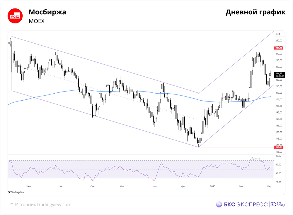 Мнение: БКС Экспресс Аналитика акций Мосбиржи. Прогнозируется, что в ближайшее время цены будут колебаться в пределах 215-233. Краткосрочная картина • Заметное повышение стоимости сопровождалось умеренным увеличением торгового оборота. Бумаги торговались существенно сильнее просевшего рынка. Покупательский интерес был подогрет запуском на Московской бирже торгов ликвидными акциями в выходные дни. Кроме того, эмитент опубликовал итоги торгов в феврале 2025 г. • В результате вчерашнего роста закрытие состоялось выше 200-часовой скользящей средней цены. По итогам дня сформировалась позитивная краткосрочная техническая картина. Вместе с тем высокое значение индикатора относительной силы RSI на часовом графике указывает, что бумаги близки к состоянию перекупленности. • После резкого вечернего движения наиболее вероятен переход бумаг Мосбиржи в состояние волатильной консолидации. Какое-то время они способны удерживаться в диапазоне 215–233 руб. Внешний фон Индекс S&P 500 вчера просел на 1,76%. Фьючерсы на S&P 500 утром повышаются в пределах 0,2%. Ключевые азиатские фондовые индексы преимущественно падают. Нефть Brent дешевеет на 0,7%, до $71,1 за баррель. Уровни сопротивления: 227 / 230 / 233 Уровни поддержки: 222 / 220 / 215 Долгосрочная картина • С середины прошлого года акции Московской биржи находились под давлением. Серьезным негативным фактором для них стало включение эмитента в санкционный список США. Однако в феврале бумаги сумели уверенно превысить 200-дневную скользящую среднюю цену. • В результате недавнего сильного повышения курса долгосрочная техническая картина улучшилась до позитивной. • Целевая цена бумаги на горизонте года, по оценке аналитиков БКС, — 330 руб. Это подразумевает потенциальный рост цены в пределах 46% от текущего уровня. Источник: bcs-express.ru Автор: Манжос Виталий [Не является индивидуальной инвестиционной рекомендацией] В этом сообщении представлено мнение экспертов инвестиционной компании или банка. Оно предоставляется исключительно для ознакомления и не является рекомендацией для покупки или продажи ценных бумаг, а также для принятия каких-либо коммерческих или других решений. mondiara.com не несёт ответственности за содержание этого сообщения и последствия его использования.