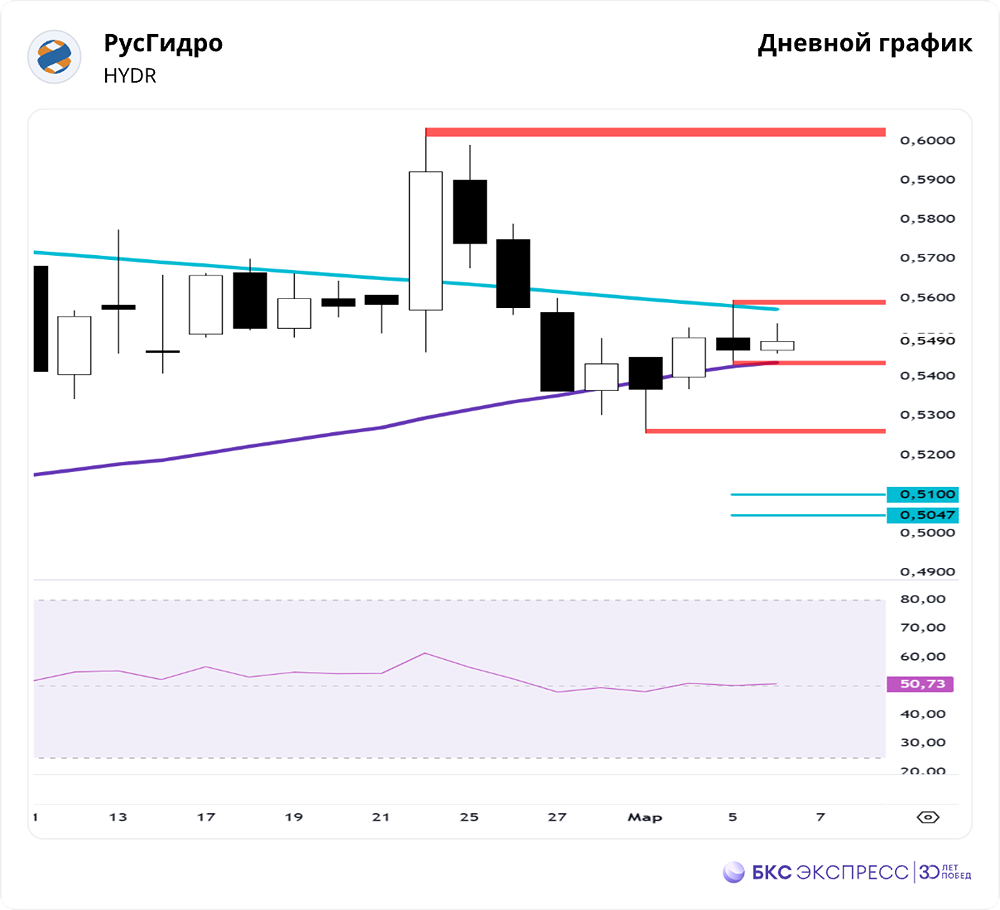 Мнение: БКС Экспресс Наметился возврат к тенденции роста. На прошлой торговой сессии акции РусГидро упали на 0,6%. Цена на закрытии составила 0,5467 руб. Акции торговались хуже рынка. Объем торгов составил 203 млн руб. Краткосрочная картина • На дневном графике прошел первый импульс падения. Для продолжения отката нужен слом отметки 0,5430. В этом случае продавцы будут тестировать минимум 0,5257. Учитываем, что задача минимум для отката выполнена и поддержка 0,5257 может устоять. • Если отметка 0,5257 будет пробита, то дорога откроется в зону 0,5047–0,51. Далее следим за реакцией покупателей и попытками разворота наверх. • На дневном графике кривая RSI на отметке 51 п. На 4-часовом графике акции торгуются между 50- и 200-дневной скользящей средней. Ближайшие важные уровни сопротивления и поддержки: 0,6034 и 0,5257. Внешний фон Индекс S&P 500 в среду вырос на 1,07%, с утра в минусе 0,1%. Индексы АТР торгуются в зеленой зоне. Нефть Brent в среду упала на 2,45%, с утра в плюсе 0,5%. Сопротивления: 0,5596 / 0,6034 / 0,62 Поддержки: 0,5430 / 0,5257 / 0,4361 Долгосрочная картина Цели и сценарии • На этой неделе сформировался первый импульс на недельном графике с минимумом 0,4361. Ждем окончания отката для оценки будущих целей. • Планы менеджмента компании по наращиванию прибыли к 2025 г. до 70 млрд руб. являются дополнительным фактором поддержки бумаг. • В долгосрочной картине нужно смотреть на закрытие недельной свечи под конец торгов пятницы. Источник: bcs-express.ru Автор: Мамонтов Андрей [Не является индивидуальной инвестиционной рекомендацией] В этом сообщении представлено мнение экспертов инвестиционной компании или банка. Оно предоставляется исключительно для ознакомления и не является рекомендацией для покупки или продажи ценных бумаг, а также для принятия каких-либо коммерческих или других решений. mondiara.com не несёт ответственности за содержание этого сообщения и последствия его использования.