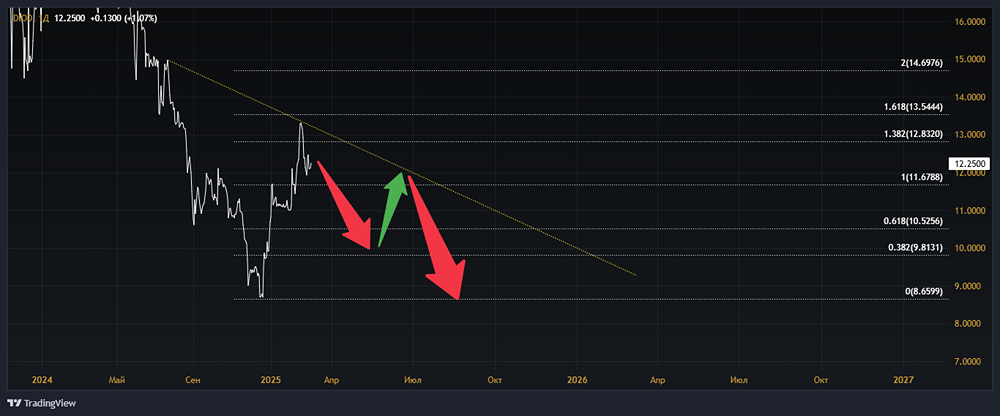 Среднесрочный технический взгляд по акциям ТФ: 1Д [день] Для расчёта будущей стоимости активов применяется алгоритмический подход, который учитывает поведение цены, основываясь на числовой последовательности Фибоначчи. Еще больше расчётов можно найти по ссылке нашего канала в социальной сети M O N D I A R A: https://i.mondiara.com/i/c/mondiara_trading Данный материал носит информационный характер и не является индивидуальной инвестиционной рекомендацией или предложением о покупке или продаже указанной ценной бумаги.