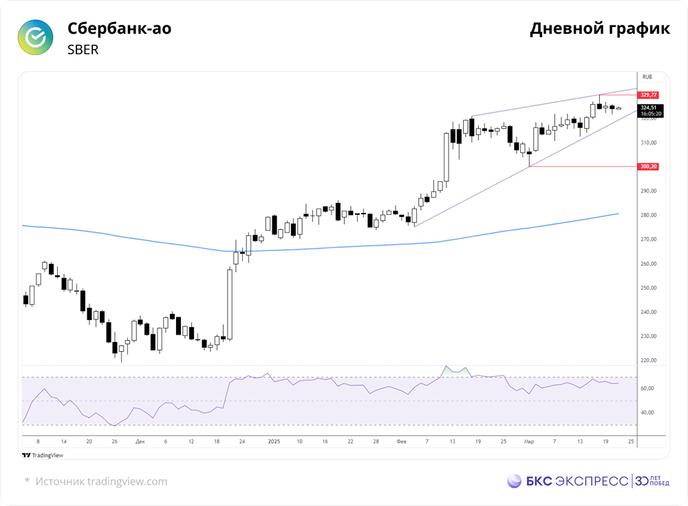 Мнение: БКС Экспресс Важная задача на среднесрочную перспективу — достичь уровня в 330. Краткосрочная картина • Умеренное падение стоимости сопровождалось средним торговым оборотом. Акции понизились вместе с Индексом МосБиржи, потерявшим сопоставимые 0,36%. Тем не менее бумаги продолжают движение в границах полуторамесячного восходящего треугольника и сохраняют шансы на дальнейший среднесрочный рост. • Закрытие вновь состоялось выше 200-часовой скользящей средней цены, но по итогам дня сформировалась умеренно негативная краткосрочная техническая картина. Среднее значение индикатора относительной силы (RSI) на часовом графике указывает, что акции далеки от состояния перепроданности или перекупленности. • В ближайшие дни в бумагах Сбера вероятны попытки тестирования краткосрочных сопротивлений. Значимой среднесрочной целью повышения выступает круглый уровень 330 руб. Внешний фон Индекс S&P 500 вчера потерял 0,22%. Фьючерсы на S&P 500 утром понижаются на 0,1%. Ключевые азиатские фондовые индексы демонстрируют разнонаправленное отклонение. Нефть Brent дорожает на 0,2%, до $72,2 за баррель. Уровни сопротивления: 327 / 330 / 333 Уровни поддержки: 322 / 320 / 317 Долгосрочная картина • От рекордных уровней цена бумаг потеряла 16%. На фоне геополитической ситуации в феврале 2022 г. был пробит многолетний тренд, берущий начало с 2014 г. • Опора найдена на уровне пологого растущего тренда, который тянется от минимумов 2009 г. • В начале 2025 г. акции Сбера уверенно превысили 200-дневную скользящую среднюю цену и значимый круглый уровень 300 руб. Долгосрочная техническая картина выглядит умеренно позитивной. • Целевая цена аналитиков БКС на горизонте года — 390 руб. Это подразумевает потенциальный рост стоимости на 20% от текущего уровня. Источник: bcs-express.ru Автор: Манжос Виталий [Не является индивидуальной инвестиционной рекомендацией] В этом сообщении представлено мнение экспертов инвестиционной компании или банка. Оно предоставляется исключительно для ознакомления и не является рекомендацией для покупки или продажи ценных бумаг, а также для принятия каких-либо коммерческих или других решений. mondiara.com не несёт ответственности за содержание этого сообщения и последствия его использования.