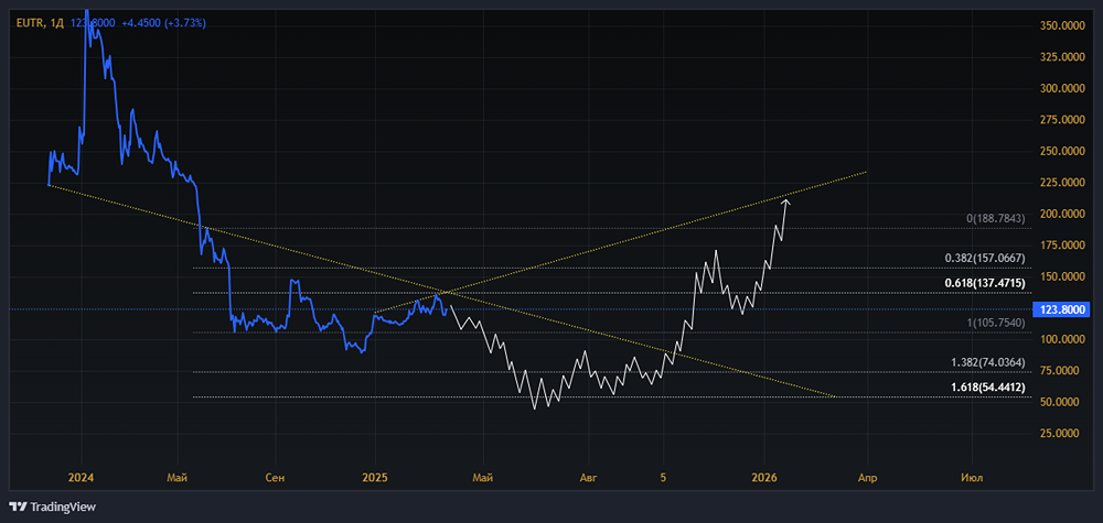 Котировки слабы и до сих пор остаются в медвежьем сезоне, с возможной целью для разворота около 50 руб. ТФ: 1Д [день] Для расчёта будущей стоимости активов применяется алгоритмический подход, который учитывает поведение цены, основываясь на числовой последовательности Фибоначчи. Данный материал носит информационный характер и не является индивидуальной инвестиционной рекомендацией или предложением о покупке или продаже указанной ценной бумаги.