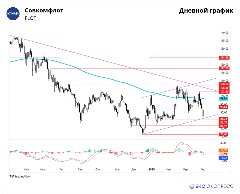 Мнение: БКС Экспресс СКФ один из лидеров рынка. В среду акции Совкомфлота прибавили в цене 5,12%. Бумага закрылась на отметке 91,81 руб. Объем торгов составил 1,42 млрд руб. — средний. Сегодня с утра котировки в плюсе на 1,5%. Краткосрочная картина • В среду котировки компании заметно выросли в цене в условиях умеренной торговой активности. Подавляющее большинство российских акций торговалось в восходящей динамике. Индекс МосБиржи завершил основную сессию снижением на 1,28%, а по итогам вечерней финишировал в плюсе на 1,64% в сравнении с вечеркой вторника. • Вчера акции Совкомфлота на протяжении всего дня двигались в активном восходящем тренде. Рост перевалил за 5%, а просадка предыдущего дня была полностью выкуплена. Позитивно. • Разворот состоялся вблизи 86 руб. — нижняя граница проторговки конца января – начала февраля. • Индикаторы дают позитивный сигнал. RSI на всех таймфреймах развернулся вверх, на четырехчасовом графике была снята перепроданность. На четырехчасовом MACD «Бычий кроссовер». • Ближайшее локальное сопротивление проходит по максимумам вторника. Далее бумаги могут беспрепятственно расти до 200-дневной скользящей, которая проходит чуть ниже 99 руб. За время падения, которое началось в конце марта, не было сформировано отчетливых уровней сопротивления. • Картина по индексу начала меняться в лучшую сторону. На четырехчасовом MACD образовался «Бычий кроссовер», а на четырехчасовом RSI в зоне перепроданности «Бычья дивергенция» — оба сигнала на отскок. Внешний фон В среду S&P 500 закрылся в плюсе на 0,67%, с утра фьючерс теряет 0,7%. Индексы АТР торгуются разнонаправленно. Фьючерс на Brent на Мосбирже в понедельник вырос на 0,28%, с утра цены на нефть на международных площадках в минусе на 0,3%, на уровне $73 за баррель. Уровни сопротивления: 93,64 / 100 / 103,2 Уровни поддержки: 86,22 / 82,2 / 76,45 Долгосрочная картина • Среднесрочная динамика акций Совкомфлота задается нисходящим трендом от января 2024 г. Более двух месяцев бумаги простояли в боковике 124,5–138,5 руб., а в июне ушли ниже. • Ближайшая среднесрочная цель — преодоление среднесрочного нисходящего тренда. • На недельном таймфрейме умеренно-пессимистичная техническая картина. На прошлой неделе состоялась неудачная попытка отскока, но котировки развернулись от 200-дневной скользящей. На текущей неделе наблюдаем мощный отскок от уровня поддержки вблизи 86 руб. • Взгляд аналитиков БКС на акции Совкомфлота «Негативный». Цель на горизонте года — 93 руб. Источник: bcs-express.ru Автор: Решетников Олег Не является индивидуальной инвестиционной рекомендацией. В этом сообщении представлено мнение экспертов инвестиционной компании или банка. Оно предоставляется исключительно для ознакомления и не является рекомендацией для покупки или продажи ценных бумаг, а также для принятия каких-либо коммерческих или других решений. mondiara.com не несёт ответственности за содержание этого сообщения и последствия его использования