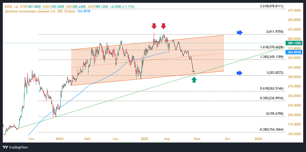 Ярко выраженный продавец у отметок в 400 рублей и постоянный покупатель на 300. Если смотреть на график и думать, что мы будем дальше расти и расти... Ну нет, так не бывает. Рынок никуда не спешит. Рынок — это математическая волна постоянного и неуклонного изменения цены. А цена — это люди, которые голосую своими деньгами, всё время борясь со страхом и жадностью. Технически выверенная картина полностью отображает возможное поведение цены уже в ближайшее будущее. Пока цена цепляется за Фибо в размере 1,618 и 200-дневную скользящую, но как только цена закрепится ниже... Будет вероятность, что и 300 рублей не удержат котировку. ТФ: 1Д [день] Для расчёта будущей стоимости активов применяется алгоритмический подход, который учитывает поведение цены, основываясь на числовой последовательности Фибоначчи. Данный материал носит информационный характер и не является индивидуальной инвестиционной рекомендацией или предложением о покупке или продаже указанной ценной бумаги.