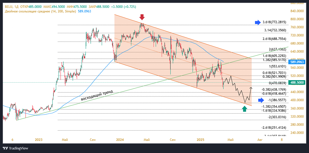 Восходящий тренд давно уже сломлен, и акция находится в понятном нисходящем тренде, и тенденция не сменена. Отчетливо прослеживается, что «сил» в акциях нет, история спекулятивная, построенная на отскоках в рамках тренда. Основная техническая сильная поддержка формируется в районе 386 рублей, откуда будет довольно-таки высокая вероятность начала изменения тенденции. ТФ: 1Д [день] Для расчёта будущей стоимости активов применяется алгоритмический подход, который учитывает поведение цены, основываясь на числовой последовательности Фибоначчи. Данный материал носит информационный характер и не является индивидуальной инвестиционной рекомендацией или предложением о покупке или продаже указанной ценной бумаги.