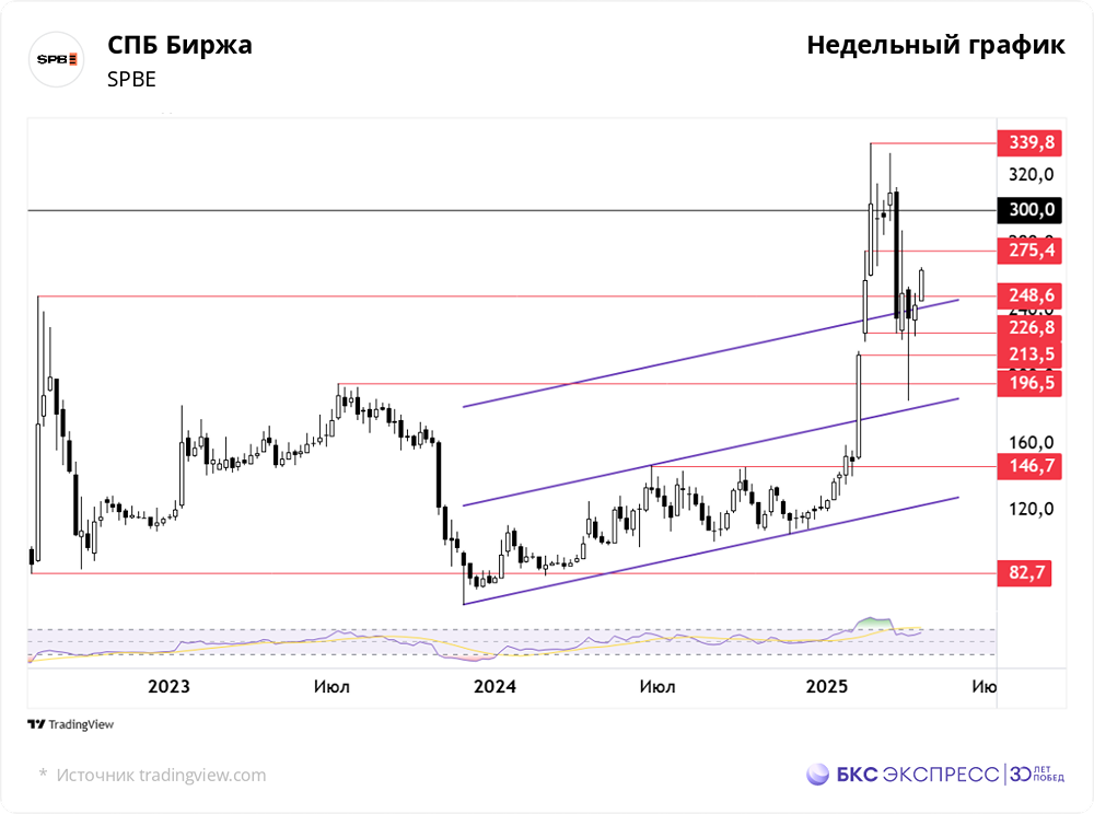 Мнение: БКС Экспресс Восстановительное движение продолжается. В понедельник акции Санкт-Петербургской биржи выросли на 5,43%, достигнув 256,5 рублей. Объём торгов был средним — 2,2 миллиарда рублей. Сегодня утром бумаги выросли в цене на 3%. Краткосрочная динамика Бумаги активно реагируют на положительные внешние факторы и завершают день в числе лидеров роста. Большинство акций Индекса Московской биржи закрылись в зелёной зоне. Сам бенчмарк вырос на 1,73% в ходе основной сессии и к вечеру прибавил ещё 2,31% по сравнению с пятничной вечерней сессией. В течение всего торгового дня котировки преимущественно росли. После утреннего гэпа вверх они продолжили расти. К началу основных торгов бумаги уже опережали рынок и демонстрировали рост более чем на 2%. В ходе основной сессии внешний позитив сохранял импульс, что позволило котировкам вырасти ещё более чем на 3%. Акции лишь один раз корректировались в ходе основной сессии, но быстро восстановились. Волатильность акций Санкт-Петербургской биржи снизилась с начала предыдущей недели. Объёмы торгов остаются стабильными и близки к средним значениям. Распределение объёмов соответствует классическому сценарию, с большим объёмом на основных торгах. Бумаги уверенно закрепились выше верхней границы зеркального канала и пробились через горизонтальный уровень 248. В пятницу прошлой недели был сформирован бычий пинбар по итогам закрытия дня. В сочетании с положительным внешним фоном это дало котировкам дополнительный импульс для роста. Разворотный сигнал пинбара от 9 апреля подтвердился, несмотря на сопротивление вблизи верхней границы восходящего канала. С минимума позапрошлой недели котировки выросли на 38%. На младших таймфреймах индекс относительной силы (RSI) приближается к зоне перекупленности. На дневном графике значение индекса остаётся выше скользящей средней, а разрыв между ними увеличивается. Бумаги закрепились выше 200-часовой скользящей средней на часовом и четырёхчасовом графиках. Внешний фон В понедельник индекс S&P 500 упал на 2,36%. Фьючерс на S&P 500 утром растёт на 0,4%. Индексы Азиатско-Тихоокеанского региона торгуются разнонаправленно. На мировых рынках утром нефть Brent растёт в цене на 0,2%, до 66,6 доллара за баррель. Уровни сопротивления: 275, 300, 340. Уровни поддержки: 248, 240, 227. Долгосрочная перспектива Акции торгуются ниже цены первичного размещения — 11,5 доллара, или 834,9 рубля по курсу Центрального банка России на 19 октября 2021 года. С момента размещения и до августа 2022 года бумаги быстро снижались, достигнув 80,8 рубля за акцию. Ключевую роль в этом снижении сыграли ограничения на торговлю иностранными акциями. После неудачной попытки восстановления в ноябре 2023 года был установлен новый исторический минимум в 63,8 рубля. В феврале 2025 года произошёл импульсный рост снизу вверх, в результате чего был пробит восходящий канал, формировавшийся более года. Этот рост был вызван спекулятивным спросом на фоне потенциальной политической оттепели. В том же месяце была пробита верхняя граница зеркального восходящего канала. В настоящее время актуальность растущего тренда тестируется. С декабря 2024 года бумага закрепилась выше 200-дневной скользящей средней цены. Источник: bcs-express.ru Автор: Смирнов Андрей Не является индивидуальной инвестиционной рекомендацией. В этом сообщении представлено мнение экспер