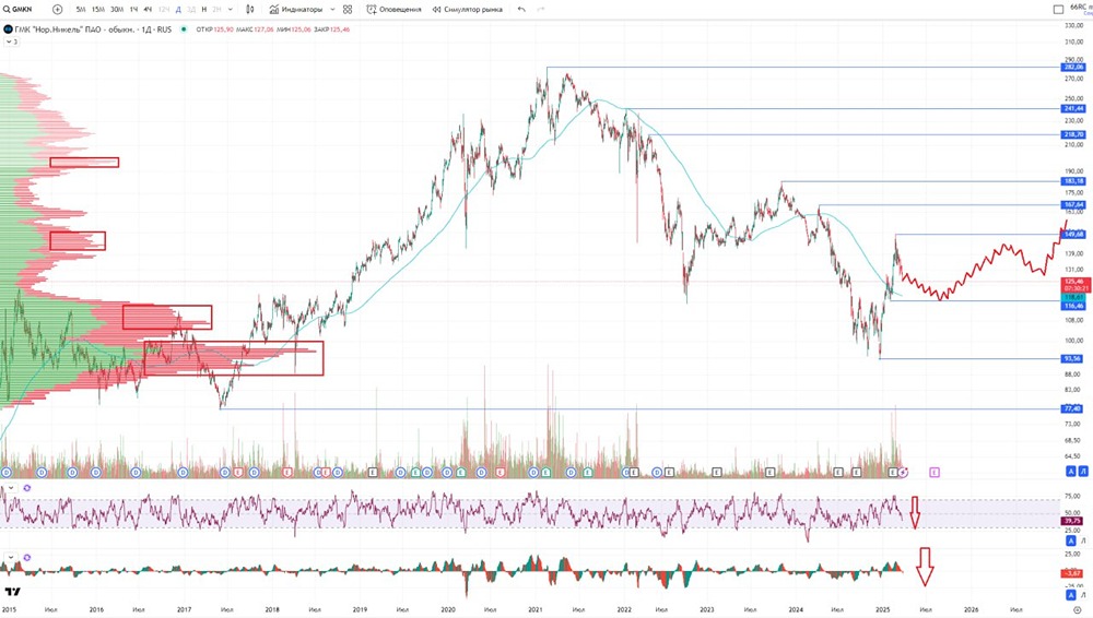 Последний обзор по Норникелю делал 28 января (https://t.me/ShumilovPavel/6945), тогда акции стоили 119 р., я ожидал коррекции к 110, а после роста к 135. По факту ходили к 116, а после росли до 150 в моменте, плюс-минус пару процентов по всем движениям, как я и предполагал, так и получилось. Сейчас акции торгуются по 125,5, давайте посмотрим, чего можно ждать дальше. ℹ️ По метрикам сейчас акции оцениваются дороже обычного. Похоже упала прибыль за год, поэтому так. Вышел отчет за 2024 год, вот его и разберем. 🗞 Новостной фон ▪️НОРНИКЕЛЬ БУДЕТ РАБОТАТЬ НАД УВЕЛИЧЕНИЕМ ДЕНЕЖНОГО ПОТОКА ДЛЯ ПОТЕНЦИАЛЬНОЙ ВЫПЛАТЫ ДИВИДЕНДОВ — ПОТАНИН ▪️ПОТАНИН: МЕНЕДЖМЕНТ НОРНИКЕЛЯ РЕКОМЕНДУЕТ НЕ ПЛАТИТЬ ДИВИДЕНДЫ ЗА 2024Г, В УСЛОВИЯХ ОТСУТСТВИЯ FCF ПЛАТИТЬ НЕПРАВИЛЬНО ▪️Норникель сообщил, что находится в активной фазе переговоров о созданиисовместного медного производства в Китае. 💰 Финансовое здоровье ▪️Собственный капитал по итогу 2024 года вырос на 21%, что лучше 2023, когда рост был 13%. ▪️Чистый долг вырос на 29% до 873B р. ▪️Net Debt / EBITDA (https://t.me/ShumilovPavel/3190) — 2.1. Долговая нагрузка в рамках года значительно выросла. Но все еще является не слишком большой, управляемой. Но она самая большая за последние 10 лет. Похожая была в 2017, но в 2018 уже сильно снизили. Возможно так будет и в этом году. ℹ️ Хорошо, что СК вырос. Но по факту он вырос за счет наращивания долга. 💰 Выручка, прибыль ▪️Выручка за 2024 год упала на 5%. Но это плюс-минус как в 2023 году, тогда она выросла на 4%. По выручке с 2021 года компания стоит в одном узком диапазоне 1,16-1,31T р. ▪️Прибыль упала на 33% в 2024 году. И вот это главная проблема. Падение прибыли идёт 3-ый год подряд. ▪️Свободный денежный поток (https://t.me/ShumilovPavel/3190) тоже упал в 2024 году на 22%. 🔮 Будущее, оценки ▪️ Свежих оценок нет. Старые две: от 195 до 221 р. 🤵♂️ Основные акционеры 38,4% — МК ООО "Интеррос капитал" 28,3% — МК ООО "Активиум" 4.9% — ООО "Холдинговая компания Интеррос" 🆚 Сравнение с конкурентами В своем секторе компания одна из самых крупных по капитализации, больше только Полюс (https://t.me/ShumilovPavel/6826). По метрикам компания оценивается дороже рынка после падения прибыли. По долговой нагрузки — по рынку или чуть выше. По метрикам рентабельности — по рынку. Рост выручки за 5 лет — чуть ниже рынка. В моем рейтинге лучших компаний в секторе Норникель занял 3 место (https://t.me/ShumilovPavel/6092?single), но возможно пришло время обновить этот рейтинг, как выйдут отчеты у всех компаний за 2024 год. 🤑 Дивиденды Последняя выплата в 2023 году. Очень может быть, что и в 2025 году их тоже не будет. Но надо посмотреть по итогу года что будет. В моменте это было бы не логичным. 📈 Технический анализ Индикаторы говорят о том, что мы подходим к нижней границе коррекции, но она еще не завершена. Думаю сходим в район 115-120. Скорее всего от туда будет отскок или возможно уже даже рост в сторону 150. Как я думаю будет движение цены — отобразил на графике. 🧠 Выводы У компании в 2024 году произошло существенно ухудшение ситуации с финансовым здоровьем. Упала прибыль и выручка. Собственный капитал вырос, но он вырос соразмерно росту долга. В целом ситуация стала хуже. Если предположить, что у нас закончилось СВО, идёт восстановление новых территорий, отмена зарубежных санкций и общий спрос растёт на продукцию Норникель, то мы попадем совершенно в другую ситуацию. Думаю, что так и будет, вопрос времени. Возможно текущая коррекция — неплохая воз