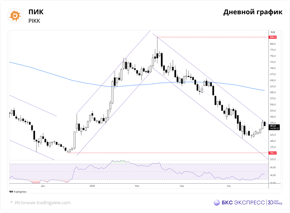 Мнение: БКС Экспресс ПИК в фокусе: Рост объемов и утренняя коррекция акций на фоне рыночного движения Вчера стоимость акций ПИК выросла на 6,27%, достигнув 478,2 рубля. Объём торгов составил 5,2 миллиарда рублей. Утром стоимость акций снизилась на 2,93%, достигнув 464,2 рубля. Краткосрочная ситуация Рост стоимости акций сопровождался увеличением объёма торгов. Акции росли вместе с рынком, но закрылись с более высокими показателями, чем Индекс МосБиржи (IMOEX2), который вырос на 1,77%. Наблюдалось ускорение технического отскока от недавнего четырёхмесячного минимума. Однако утром стоимость акций ПИК уже снизилась примерно на половину от вчерашнего роста. Закрытие произошло выше 200-часовой скользящей средней цены. В результате сформировалась позитивная краткосрочная техническая картина. На утренних торгах значение индикатора относительной силы RSI на часовом графике значительно снизилось. Это означает, что акции вышли из состояния краткосрочной перекупленности, которое наблюдалось вечером. В среду утром акции заметно снизились относительно краткосрочного максимума. В связи с этим в ближайшие дни они могут перейти в состояние волатильной консолидации в диапазоне от 450 до 490 рублей. Внешний фон Вчера индекс S&P 500 вырос на 2,51%. Фьючерсы на S&P 500 сегодня утром прибавили 1,6%. Ключевые азиатские фондовые индексы в основном растут. Цена на нефть марки Brent увеличилась на 0,9%, достигнув 68 долларов за баррель. Уровни сопротивления: 473 / 480 / 487 Уровни поддержки: 463 / 450 / 445 Долгосрочная ситуация В конце марта 2025 года акции ПИК закрепились ниже 200-дневной скользящей средней цены. Долгосрочная техническая картина стала нейтральной. В среднесрочной перспективе слабость акций связана с ухудшением фундаментальных условий. В первой половине 2024 года компания попала под санкции США и отказалась от выплаты годовых дивидендов. Позднее негативную роль сыграло общее ухудшение ситуации в сфере жилищного строительства из-за сокращения доступности льготных ипотечных кредитов. Аналитики БКС прогнозируют рост стоимости акций ПИК до 700 рублей в течение года. Это означает, что стоимость акций может вырасти примерно на 47% от текущего уровня. Источник: bcs-express.ru Автор: Манжос Виталий Не является индивидуальной инвестиционной рекомендацией. В этом сообщении представлено мнение экспертов инвестиционной компании или банка. Оно предоставляется исключительно для ознакомления и не является рекомендацией для покупки или продажи ценных бумаг, а также для принятия каких-либо коммерческих или других решений. mondiara.com не несёт ответственности за содержание этого сообщения и последствия его использования.