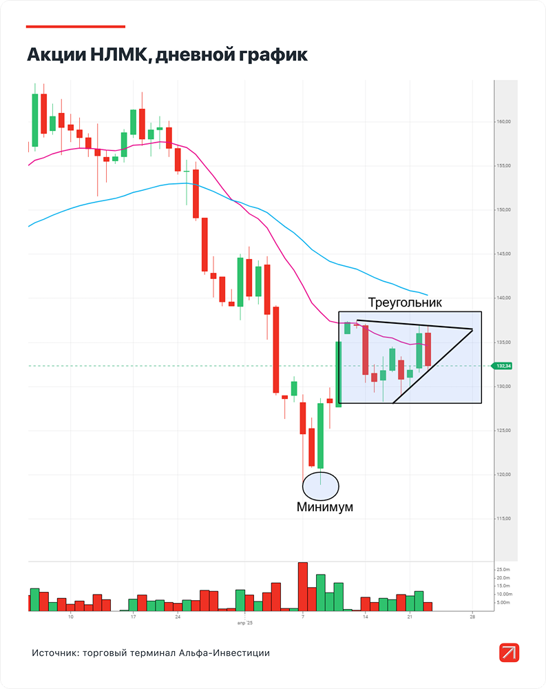 Мнение: Альфа-Инвестиции Торговый взгляд на акции НЛМК. Торговый план • Покупка (лонг): акций НЛМК по цене 134,02 руб. • Срок: 1–2 недели • Цель: 140,94 руб. за акцию • Потенциальная доходность: 5,1% Информация о росте стоимости акций На дневном графике наблюдается формирование технического паттерна, который указывает на продолжение восходящего тренда после достижения минимума и последующего отскока. На часовом графике можно более детально рассмотреть техническую фигуру, которая указывает на продолжение восходящей тенденции — «Треугольник». После импульса от 9 апреля были сформированы все четыре точки построения ABCD. Точка входа В качестве стандартной точки входа можно использовать закрепление цены выше 20- и 50-часовой экспоненциальных скользящих средних (EMA) на уровне 134,02 рубля. Эта цена выше текущей, и для завершения технического паттерна необходимо дождаться её достижения, прежде чем совершать сделку, так как вероятность продолжения роста значительно возрастает. Не стоит забывать о рисках Идея основана на техническом анализе, поэтому для ограничения потенциальных убытков рекомендуется разместить защитную стоп-заявку на уровне 131,18 рубля. Ориентируйтесь на расположение уровня точки D. Если цена опустится ниже него, то с высокой вероятностью технический паттерн перерисуется, и идея потеряет свою актуальность. Источник: alfabank.ru Автор: Роман Житник Не является индивидуальной инвестиционной рекомендацией. В этом сообщении представлено мнение экспертов инвестиционной компании или банка. Оно предоставляется исключительно для ознакомления и не является рекомендацией для покупки или продажи ценных бумаг, а также для принятия каких-либо коммерческих или других решений. mondiara.com не несёт ответственности за содержание этого сообщения и последствия его использования.
