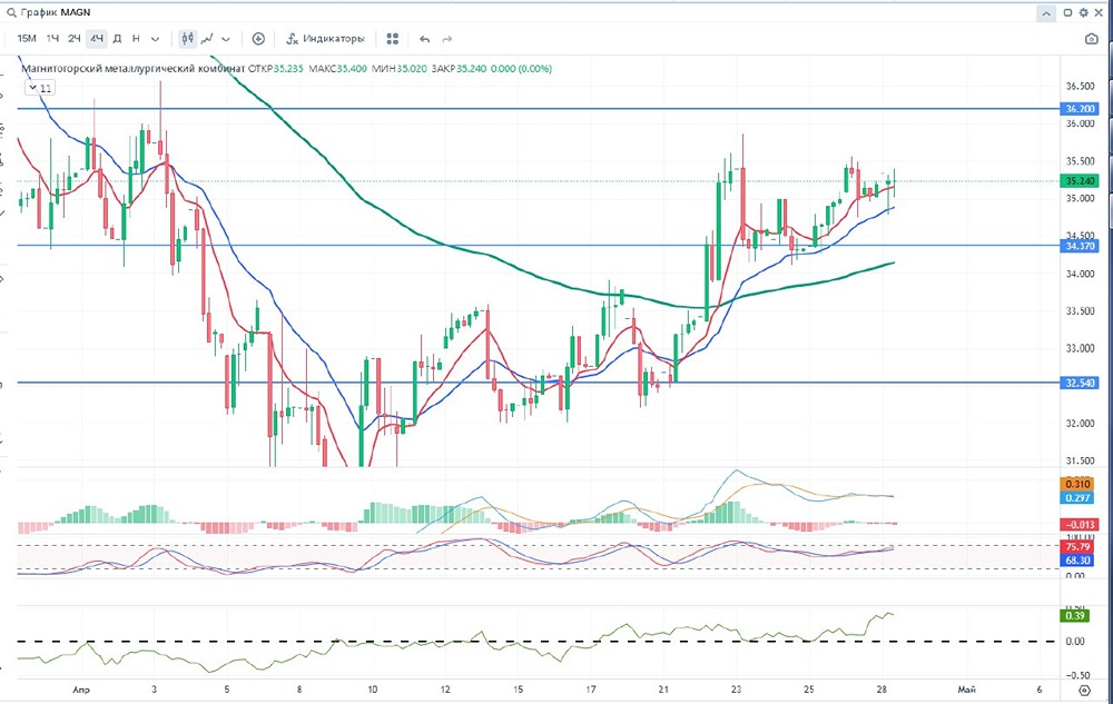Добрый день уважаемые дамы и господа, инвесторы и трейдеры! 🚨 ПАО «Магнитогорский металлургический комбинат» входит в число крупнейших производителей стали и занимает лидирующие позиции среди предприятий черной металлургии России. Активы компании в России представляют собой крупный металлургический комплекс с полным производственным циклом, начиная с подготовки железорудного сырья и заканчивая глубокой переработкой черных металлов. ММК производит широкий сортамент металлопродукции с преобладающей долей продукции с высокой добавленной стоимостью. ✅Позитив: 📍1. ММК увеличил продажи металлопродукции в 1 квартал 2025 года на 2,8% по сравнению с предыдущим кварталом. 📍2. Большая часть выручки генерируется в России, а это снижает зависимость от экспорта и санкций 📍3. Низкие мультипликаторы привлекательны для долгосрочных инвесторов 📍4. Низкая долговая нагрузка ⛔Негатив: 📍1. Финансовые результаты ММК за 1квартал 2025 года оказались ниже ожиданий 📍2. Санкционное давление: введены санкции на черные металлы из России, что влияет на экспортные возможности 📍3. Конкуренция с другими производителями 📍4. Высокая КС 📢Дополнительно: 🥇1. Чистая прибыль ММК по МСФО за 2024 год составила ₽79,7 млрд, что на 32,7% ниже по сравнению с ₽118,4 млрд в предыдущем году. 🥈2. Выручка увеличилась на 0,7% до ₽768,5 млрд против ₽763,4 млрд годом ранее. 🥉3. Объём производства стали снизился на 13,4% до 2,57 млн тонн. Выплавка чугуна сократилась на 6,9%, до 2,18 млн тонн. Производство угольного концентрата снизилось на 9,6% до 0,8 млн тонн. 💵Дивиденды: Дивидендная политика (ноябрь 2019 г.) ММК подразумевает выплату дивидендов в размере не менее 100% свободного денежного потока (FCF), если чистый долг/EBITDA менее 1.0х. В случае превышения коэффициентом значения 1.0х, сумма средств, направляемая на выплату дивидендов, будет составлять не менее 50% свободного денежного потока. Компания имеет низкую долговую нагрузку, сохраняя возможность наращивания дивидендных выплат. 💴 - $MAGN : ФА Капитализация - 430.5 млрд ₽ Кол-во акций ао– 11174.0 млн Кол-во акций ап– 0.0 млн Р/Е - 5.39 P/S - 0.56 P/BV - 0.63 ROE - 11.6% EV/EBITDA - 2.38 DSI 0.07 💡Данные взяты из официальных и публичных источников и отражают состояние за базовый 2024 год, а не на момент публикации поста. ⏰ - ТФ 1 DAY 🛠 ТА - скользящие, стохастик, объем, МАСD, уровни. 📈- тренд вверх ‼- Гистограмма MACD в положительных значениях, линии MACD находятся в отрицательных значениях. Стохастик находится выше средней лини у зоны перепроданности. 26 марта цена пересекла сверху вниз 100ема и показывает нисходящую тенденцию. При закрытии дня ниже 34.292 возможен разворот в шорт. ⏰ -ТФ 4 часа 🛠 ТА - скользящие, стохастик, объем, МАСD, уровни. 📈- тренд вниз ‼ - Гистограмма MACD в отрицательных значениях, линии MACD находятся в положительных значениях. Стохастик находится выше средней лини у зоны перепроданности. При закрытии ниже 34.847 возможен разворот в шорт. 📈 Вероятные сценарии движения цены по ТА: В данный момент цена находится между двумя уровнями 34.37 и 36.2. Закрытие дня ниже 34.292 открывает путь для движения к 32.5, но именно на данный момент такой сценарий менее вероятен. Закрепление же выше 35.36 дает шанс похода до 36.2 и в случае удачного пробоя уход к 36.5 , а там уже следить далее за происходящим. 📊За 6 (10.24-03.25) месяцев цена снизилась более чем на 21% . Мин. Рrice = 29.29 Мах. Рrice = 45.195 📌 Цены смены тренда указаны в соотве