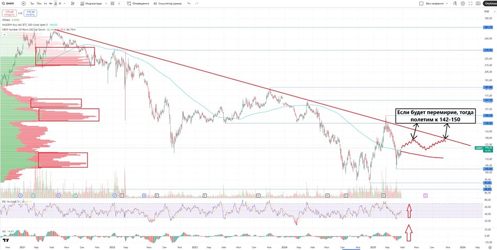 Последний обзор по Норникелю делал 25 марта, тогда акции стоили 125 р. я ожидал падения до 116, а от туда роста до 140. По факту мы падали существенно глубже на 103 р. и от туда начался отскок. Сейчас торгуется по 119. Чего ждать дальше, давайте разбираться. ℹ️ Оценивается чуть дешевле, чем в прошлом обзоре из-за падения стоимости акций. Отчета за 1 кв 2025 еще не было. 🗞 Новостной фон ▪️Норникель, производственные результаты 1кв2025: никель - 42 тыс. т (-1.1% г/г), медь - 109 тыс. т (-0,4 г/г), палладий: 741 тыс. унций (-0.6% г/г) 💰 Финансовое здоровье ▪️Собственный капитал по итогу 2024 года вырос на 21%, что лучше 2023, когда рост был 13%. ▪️Чистый долг вырос на 29% до 873B р. ▪️Net Debt / EBITDA (https://t.me/ShumilovPavel/3190) — 2.1. Долговая нагрузка в рамках года значительно выросла. Но все еще является не слишком большой, управляемой. Но она самая большая за последние 10 лет. Похожая была в 2017, но в 2018 уже сильно снизили. Возможно так будет и в этом году. ℹ️ Хорошо, что СК вырос. Но по факту он вырос за счет наращивания долга. 💰 Выручка, прибыль ▪️Выручка за 2024 год упала на 5%. Но это плюс-минус как в 2023 году, тогда она выросла на 4%. По выручке с 2021 года компания стоит в одном узком диапазоне 1,16-1,31T р. ▪️Прибыль упала на 33% в 2024 году. И вот это главная проблема. Падение прибыли идёт 3-ый год подряд. ▪️Свободный денежный поток (https://t.me/ShumilovPavel/3190) тоже упал в 2024 году на 22%. 🔮 Будущее, оценки ▪️ Свежих оценок нет. Старые две: от 195 до 221 р. 🤵♂️ Основные акционеры 38,4% — МК ООО "Интеррос капитал" 28,3% — МК ООО "Активиум" 4.9% — ООО "Холдинговая компания Интеррос" 🆚 Сравнение с конкурентами В своем секторе компания одна из самых крупных по капитализации, больше только Полюс (https://t.me/ShumilovPavel/7808). По метрикам компания оценивается дороже рынка после падения прибыли. По долговой нагрузки — по рынку или чуть выше. По метрикам рентабельности — по рынку. Рост выручки за 5 лет — чуть ниже рынка. 🤑 Дивиденды Последняя выплата в 2023 году. Очень может быть, что и в 2025 году их тоже не будет. Но надо посмотреть по итогу года что будет. 📈 Технический анализ Пока что Норникель выглядит слабее с точки зрения тех. анализа большинства других российских акций. Геополитика давит на акции компании. Так как это приводит к небольшому, но все же падению выручки, прибыли. Акции пытаются пробить нисходящий тренд с 2021 года, но пока каждый раз не получается. При том та геополитика о которой я говорю не только про отношения России-США, но и про Китай-США, а также Китай в отдельности. И по всем этим направлениям есть определенные проблемы. Вернемся к технике. Индикаторы на дневном ТФ за рост. Ожидаю продолжения роста 1-2 неделю. После можем уйти в коррекцию, если не будет позитива по перемирию. Если же будет — можем пробить линию нисходящего тренда и уйти в район 142-150 р. за акцию. Наиболее реалистичное движение и куда пойдем при позитиве отобразил на графике. 🧠 Выводы Есть определенные сложности с падением прибыли/выручки. В условиях всевозможных санкций компания еще неплохо держится, обвала нет. Геополитика ключевой сдерживающий рост компании момент. Отменят санкции, акции взлетят. Но когда — это сложно сказать. 🤓 Соблюдаем букву закона: Не является индивидуальной инвестиционной рекомендацией. Источник: https://t.me/ShumilovPavel