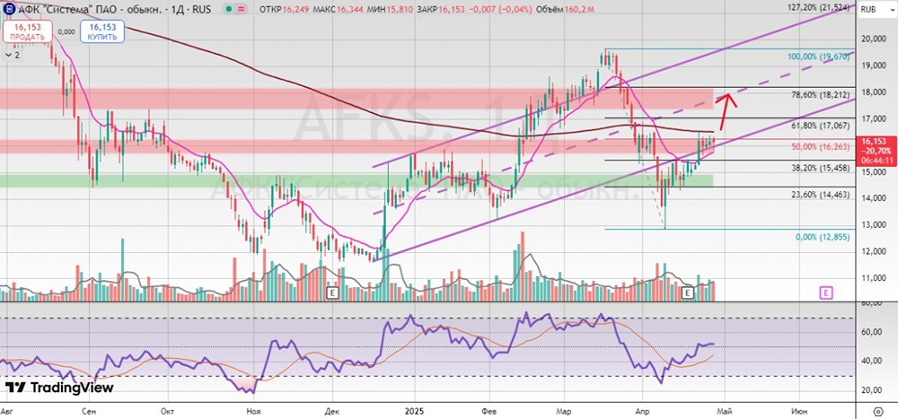 Лонг, среднесрок. ✒️ Актив вернулся в восходящий канал (сиреневый) и закрепился над 13 ema (розовая скользящая) в районе 50 фибо. Идёт поджатие к 200 ema (коричневая скользящая) с попыткой верхнего теста. Покупатель в бумаге есть. Весьма вероятно пробитие скользящей. Пробовать набирать позиции можно только при закреплении от 16.62 (выше 200 ema). В случае реализации бычьего сценария - целью будет служить уровень 18, у середины канала. Ориентировочная разметка представлена красной стрелкой. Объёмы покупок растут. RSI в зоне интереса покупателей. Данный материал носит информационный характер и не является индивидуальной инвестиционной рекомендацией или предложением о покупке или продаже указанной ценной бумаги. Источник: https://t.me/UHBECTUPYEM_BbIrODNO