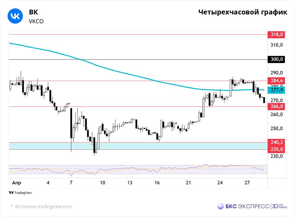 Мнение: БКС Экспресс Нейтральные перспективы ВК. Техническая картина. В понедельник стоимость акций ВК снизилась на 3,77% и достигла отметки в 272,9 рубля. Объём торгов был средним и составил 1,2 млрд рублей. На данный момент акции демонстрируют снижение на 1,5% по сравнению с закрытием предыдущего дня. Краткосрочная динамика Акции ВК стали одними из лидеров падения на российском рынке. Индекс МосБиржи не показал единой динамики по итогам основной сессии. По итогам основной сессии бенчмарк вырос на 0,94%, а на вечерних торгах потерял 0,3% по сравнению с закрытием пятничных торгов. Сразу после значительного роста в пятницу акции начали корректироваться на утренних торгах понедельника. Попытка разворота была предпринята при поддержке внешних факторов в середине основной сессии, но оказалась безуспешной. К началу вечерних торгов падение удалось замедлить. Однако затем были обновлены дневные минимумы, и весь результат пятничных торгов был нивелирован. В пятницу рост акций был остановлен сопротивлением вблизи отметки 285. В понедельник уровень был протестирован, но безрезультатно. Ближайшая поддержка находится около отметки 266, что предполагает снижение на 2,3% от закрытия понедельника. По мере приближения к внеочередному общему собранию акционеров колебания могут усилиться, что заставляет обратить внимание на ближайшую поддержку. Негативная динамика привела к снижению индекса RSI на большинстве временных интервалов. На часовом графике индекс находится в зоне перепроданности, в то время как на старших временных интервалах RSI только начинает снижаться от уровня 50. Котировки закрепились выше EMA 200 на часовом графике и тестируют скользящую с аналогичным периодом на 4-часовом графике. Внешний фон В понедельник индекс S&P 500 вырос на символические 0,06%. Фьючерс на S&P 500 утром показывает рост на 0,2%. Индексы Азиатско-Тихоокеанского региона в основном демонстрируют снижение. На мировых рынках утром нефть марки Brent снижается на 0,7% и торгуется по цене $65,2 за баррель. Уровни сопротивления: 284, 300, 318 Уровни поддержки: 266, 240, 221 Долгосрочная динамика В августе 2023 года началась коррекция от локального максимума. Снижение приостановилось к концу 2024 года, но котировки всё ещё ниже наклонных трендовых линий. В конце ноября 2024 года уровень 235–240 уже выступал в качестве опоры для акций. В прошлый раз разворот от этого уровня позволил акциям вырасти более чем на 50% в течение следующего месяца. С мая 2024 года котировки закрепились ниже 200-дневной скользящей средней. Возвращение к этому уровню является среднесрочной целью. Акции ВК демонстрируют тенденцию к более сильным движениям по сравнению с рынком в целом. Бумаги чувствительны к изменениям процентных ставок из-за низкой рентабельности бизнеса. Кроме того, существует риск избыточного предложения акций из-за дополнительной эмиссии. Эти факторы повышают волатильность котировок. Аналитики БКС прогнозируют рост стоимости акций до 300 рублей в течение года, что предполагает рост на 11% от текущего уровня. Прогноз по акциям ВК — нейтральный. Источник: bcs-express.ru Автор: Смирнов Андрей Не является индивидуальной инвестиционной рекомендацией. В этом сообщении представлено мнение экспертов инвестиционной компании или банка. Оно предоставляется исключительно для ознакомления и не является рекомендацией для покупки или 