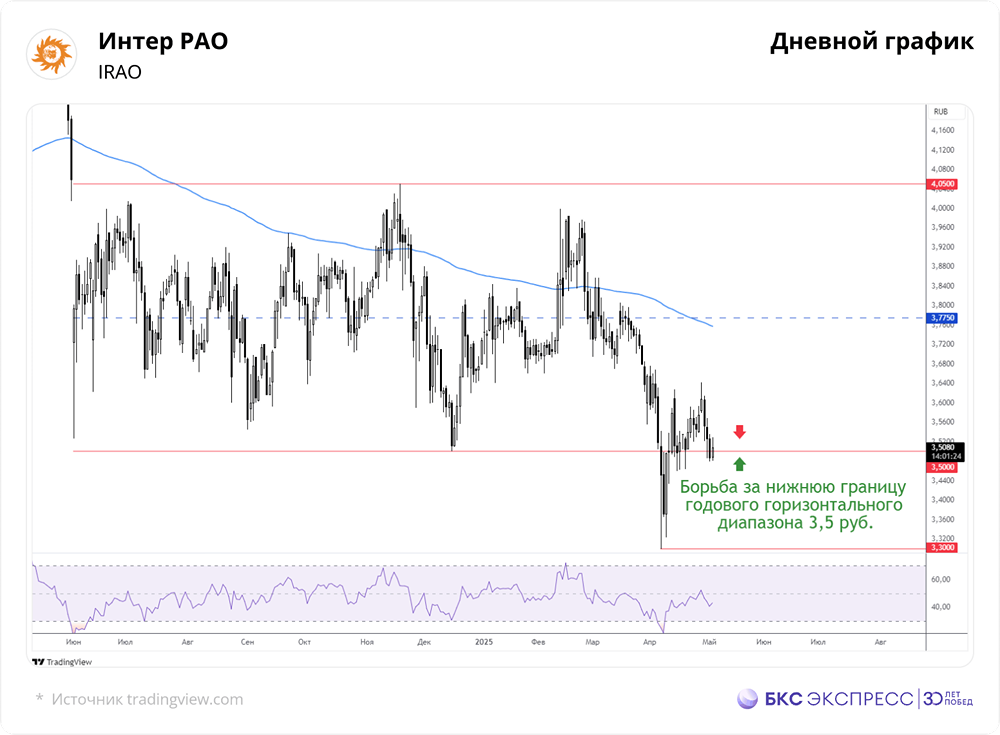 Мнение: БКС Экспресс Ситуация в компании ИнтерРАО располагает к росту. Вчера акции «Интер РАО» подорожали на 0,83% по сравнению с пятничным закрытием, до 3,5165 рубля. Объём торгов составил 60 миллионов рублей. На утренней сессии бумаги потеряли в цене 0,59%, опустившись до 3,5065 рубля. Краткосрочная ситуация Умеренное повышение стоимости акций в выходные дни сопровождалось небольшим объёмом торгов. Бумаги «Интер РАО» формально вернулись в диапазон от 3,5 до 4,05 рубля, который был задан в прошлом году. Однако говорить о том, что они закрепились в нём, пока рано. Закрытие торгов вновь произошло ниже 200-часовой скользящей средней цены, но по итогам дня сложилась позитивная краткосрочная техническая картина. Индикатор относительной силы RSI на часовом графике показывает, что бумаги далеки от состояния перекупленности или перепроданности. В ближайшие дни в акциях «Интер РАО» продолжится борьба за уверенное закрепление выше или ниже важного уровня в 3,5 рубля. Преодоление этой отметки станет позитивным сигналом для дальнейшего роста в среднесрочной перспективе. Внешний фон Индекс S&P 500 в пятницу вырос на 1,47%. Фьючерсы на S&P 500 утром теряют в цене 0,7%. Ключевые азиатские фондовые рынки сегодня закрыты из-за национальных праздников. Нефть марки Brent дешевеет на 3%, до 59,5 доллара за баррель. Уровни сопротивления: 3,53 / 3,55 / 3,57. Уровни поддержки: 3,5 / 3,48 / 3,46. Долгосрочная ситуация К началу мая акции «Интер РАО» не смогли закрыть годовой дивидендный разрыв и упали значительно ниже 200-дневной скользящей средней цены. Долгосрочная техническая картина остаётся неопределённой. Однако с учётом фундаментальных факторов перспективы бумаг энергетического холдинга выглядят многообещающе. Особенно стоит отметить значительные денежные резервы на балансе компании. Аналитики БКС оценивают целевую цену акций на горизонте года в 5 рублей, что предполагает потенциальный рост стоимости на 43% от текущего уровня. Источник: bcs-express.ru Автор: Манжос Виталий Не является индивидуальной инвестиционной рекомендацией. В этом сообщении представлено мнение экспертов инвестиционной компании или банка. Оно предоставляется исключительно для ознакомления и не является рекомендацией для покупки или продажи ценных бумаг, а также для принятия каких-либо коммерческих или других решений. mondiara.com не несёт ответственности за содержание этого сообщения и последствия его использования.