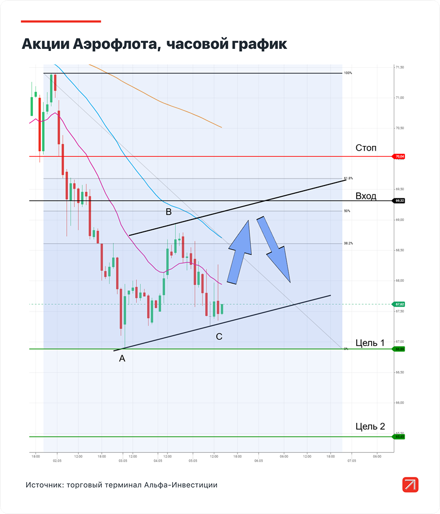 Мнение: Альфа-Инвестиции Торговый взгляд на акции Аэрофлота. Торговый план • Продажа (шорт): акции Аэрофлота по цене 69,32 руб. • Срок: 2–3 недели • Цели: 66,89 и 65,45 руб. за акцию • Потенциальная доходность: 4,5% В настоящее время на дневном графике формируется технический паттерн, который может свидетельствовать о продолжении тренда. Об этом говорит одновременное снижение 20- и 50-дневных EMA. Акция находится в среднесрочном нисходящем тренде, поскольку цена закрытия ниже индикаторов наблюдается уже четыре торговые сессии подряд. На часовом графике можно увидеть более детальное формирование фигуры, которая подтверждает нисходящую тенденцию. После импульса от 30 апреля сформировались только три точки построения ABC. Необходимо дождаться формирования четвёртой точки, чтобы завершить паттерн. Если этого не произойдёт и актив сразу опустится ниже точки А, идея потеряет актуальность. Если цена начнёт активно расти, формируя точку D, можно попытаться поймать нестандартную точку входа на уровне 69,32 руб. Этот уровень расположен на наклонной, которая параллельна отрезку AC и проходит через точку B. Если рынок отреагирует на эту точку и не поднимется выше, то можно будет открыть позицию с коротким стопом и хорошим соотношением риска и прибыли. Цель можно разделить на две части: 66,89 и 65,45 руб. При достижении первой цели необходимо закрыть 50% позиции и перенести стоп в безубыток с учётом комиссии. При достижении второй цели нужно будет докупить оставшуюся половину позиции. Стоп-заявку можно разместить на уровне 70,04 руб. Ориентиром может служить уровень отката Фибоначчи для всего импульса — 61,8%. Если цена поднимется выше этого уровня, то с высокой вероятностью произойдёт слом технического паттерна, и идея потеряет актуальность. Источник: alfabank.ru Автор: Роман Житник Не является индивидуальной инвестиционной рекомендацией. В этом сообщении представлено мнение экспертов инвестиционной компании или банка. Оно предоставляется исключительно для ознакомления и не является рекомендацией для покупки или продажи ценных бумаг, а также для принятия каких-либо коммерческих или других решений. mondiara.com не несёт ответственности за содержание этого сообщения и последствия его использования.