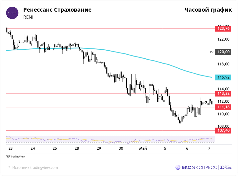Мнение: БКС Экспресс Акции компании Ренессанс сломали негативный тренд. В ходе торгов вторника акции «Ренессанс Страхования» выросли на 1,4%, достигнув отметки в 111,5 рублей. Объём торгов был выше среднего и составил 275 миллионов рублей. Сегодня утром стоимость акций снизилась на 0,6% по сравнению с закрытием предыдущего дня. Краткосрочная ситуация Акции частично восстановили потери после продолжительного снижения, но показали результат хуже, чем рынок в целом. Большинство акций из индекса Мосбиржи закрылись в плюсе. Сам индекс вырос на 2,97% за основную сессию, а на вечерних торгах прибавил ещё 1,79% относительно закрытия понедельника. Значение индекса Мосбиржи снова превысило отметку в 2800 пунктов. После пятидневного снижения котировки акций прервали падение. Рост стоимости акций во вторник был обусловлен одним импульсом в конце основной сессии. До и после этого момента котировки были неуверенными. Колебания компенсировались в течение часа, что привело к нулевой динамике. В первой половине торгов акции тестировали сопротивление на уровне 111,2, которое вскоре было преодолено. Импульс угасал по мере приближения к 200-дневной скользящей средней, около которой была закрыта дневная свеча. Преодоление двух близких сопротивлений будет указывать на продолжение разворота. Отскок котировок произошёл на высоких объёмах торгов. Учитывая, что предыдущее падение сопровождалось низкими торговыми объёмами, можно говорить о положительном техническом сигнале. Отметим, что ликвидность в акциях невысокая, и для значительного роста котировок требуется привлечение небольшого объёма капитала. На дневном графике индекс относительной силы (RSI) покинул зону перепроданности и приблизился к скользящей средней. На старших таймфреймах индекс находится около значения 50. На часовом и 4-часовом графиках котировки находятся ниже 200-дневной скользящей средней с 28 апреля 2023 года. На дневном таймфрейме бумаги тестируют 200-дневную скользящую среднюю. Внешний фон В понедельник индекс S&P 500 снизился на 0,77%. Фьючерс на S&P 500 утром растёт на 0,7%. Индексы Азиатско-Тихоокеанского региона в основном растут. На мировых рынках утром нефть марки Brent дорожает на 1%, достигая отметки в 62,7 доллара за баррель. Уровни сопротивления: 113,3, 123,8, 129. Уровни поддержки: 111,2, 107,4, 100. Долгосрочная перспектива В октябре 2021 года акции «Ренессанс Страхования» были размещены по цене 120 рублей за акцию. В тот же день был достигнут исторический максимум, когда цена достигла 150 рублей. С февраля 2022 года акции следуют восходящему тренду. В декабре 2023 года бумаги использовали этот тренд в качестве опоры для формирования трёхмесячного восходящего канала. За это время котировки выросли более чем на 53% от минимальных значений декабря. В конце марта 2024 года акции преодолели восходящий канал и начали стремительно снижаться. За две недели котировки упали примерно на 22%. Акции остановились в падении вблизи 200-дневной скользящей средней после отскока от уровня поддержки 107,4. Текущая коррекция вновь нашла поддержку в виде EMA 200. Это не позволило преодолеть апрельские минимумы и создало технические условия для разворота. Среднесрочное условие для роста котировок — закрепление выше 200-дневной скользящей средней. Источник: bcs-express.ru Автор: Смирнов Андрей Не является индивидуальной инвестиционной рекомендацией. 