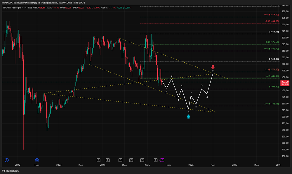 Возможно, на недельном ТФ и сформировано двойное дно, но глобально картинка сформирована на продолжение движения вниз. Основная поддержка выстроена в районе 350 рублей. Основная цель для отскока и формирования роста сформирована на уровне 471 руб. за акцию. ТФ: 1Н [неделя] Биржевой график — это источник визуальной информации о движении цен активов на рынке. Его создание основывается на сложных математических алгоритмах и теориях, которые помогают трейдерам делать прогнозы о будущем движении цен. Одним из ключевых элементов в аналитике являются числа Фибоначчи и связанные с ними уровни. График строится на основе последовательных ценовых точек, полученных за определенный период. Эти данные формируют временной ряд, который отображается в виде линий или свечей. Биение рынка закодировано в числах и алгоритмах: от простых трендовых линий до сложных моделей с числами Фибоначчи и статистическими расчетами. Использование этих методов позволяет трейдерам выявлять уровни входа и выхода, прогнозировать развороты и закреплять успешные стратегии. Еще больше наших расчётов можно найти в нашем публичном [авторском блоге](https://i.mondiara.com/i/c/mondiara_trading) в социальной сети для трейдером и инвесторов [mondiara.com](https://mondiara.com/communities?open=community-17&pinned=community-21) Данный материал носит информационный характер и не является индивидуальной инвестиционной рекомендацией или предложением о покупке или продаже указанной ценной бумаги.