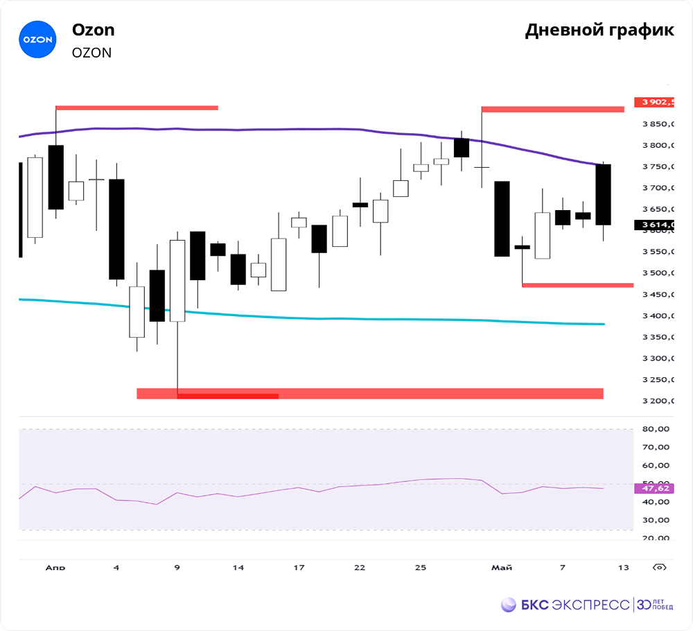Мнение: БКС Экспресс Цели роста по АДР Озон (Ozon) На прошлой торговой сессии акции Ozon снизились на 0,39%. На закрытии их стоимость составила 3614 рублей. В ходе торгов бумаги демонстрировали более слабую динамику по сравнению с рынком. Объём торгов составил 0,59 миллиарда рублей. Краткосрочный анализ В начале недели покупатели проявили активность, преодолев уровень сопротивления 3700. Это открыло путь к новым целям роста в диапазоне от 4091 до 4155 рублей, которые были обозначены в долгосрочной перспективе. Текущий максимум был достигнут на отметке 3763,5 рубля. Для дальнейшего роста необходимо преодолеть этот уровень. На дневном графике индекс относительной силы (RSI) находится на уровне 47 пунктов. На 4-часовом графике котировки находятся ниже 50- и 200-дневной скользящих средних. В первую очередь следует обратить внимание на уровни сопротивления и поддержки: 3763,5 и 3468 рублей. Внешний фон В понедельник индекс S&P 500 вырос на 3,29%, но к утру понедельника он снизился на 0,3%. Индексы Азиатско-Тихоокеанского региона демонстрируют смешанную динамику. Стоимость нефти марки Brent в понедельник выросла на 1,64%, но к утру понедельника она снизилась на 0,1%. Уровни сопротивления: 3763,5 / 3893 / 4107 рублей. Уровни поддержки: 3468 / 3206 / 3028 рублей. Долгосрочная перспектива Пока не был преодолён уровень поддержки 3206 рублей, сохраняется потенциал роста на недельном графике. Текущие цели роста: 1) 4091–4155 рублей; 2) 4400–4530 рублей. Эти цели остаются актуальными до тех пор, пока не будет пробит уровень 3468 рублей. Краткосрочные цели движения определяются в соответствии с краткосрочной перспективой. В долгосрочной перспективе необходимо обратить внимание на закрытие недельной свечи в конце торговой сессии пятницы. Ozon — вторая по величине площадка электронной коммерции в России после Wildberries. Источник: bcs-express.ru Автор: Мамонтов Андрей Не является индивидуальной инвестиционной рекомендацией. В этом сообщении представлено мнение экспертов инвестиционной компании или банка. Оно предоставляется исключительно для ознакомления и не является рекомендацией для покупки или продажи ценных бумаг, а также для принятия каких-либо коммерческих или других решений. mondiara.com не несёт ответственности за содержание этого сообщения и последствия его использования.