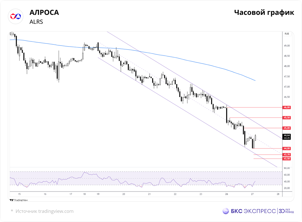 Мнение: БКС Экспресс Возможен рост стоимости бумаг АЛРОСА Вчера стоимость акций компании АЛРОСА снизилась на 3,26%, до 44,48 рублей. Объём торгов составил 0,8 миллиарда рублей. На утренней сессии акции выросли в цене на 0,56%, до 47,73 рублей. Краткосрочный анализ Стоимость акций значительно снизилась, что сопровождалось увеличением объёма торгов. Акции не только выглядели слабее рынка, но и обновили свой десятилетний минимум. Их среднесрочная слабость напрямую связана с затянувшимся кризисом на мировом рынке природных алмазов. Закрытие произошло ниже 200-часовой скользящей средней цены. По итогам дня сформировалась негативная краткосрочная техническая картина. Утренний рост значения индикатора относительной силы RSI на часовом графике указывает на то, что акции уже вышли из состояния перепроданности. В ближайшие дни акции АЛРОСА могут восстановиться до важной круглой отметки в 45 рублей. Ранее на этом уровне находилось множественное среднесрочное дно. Вероятно, оно снова станет уровнем поддержки. Внешний фон Индекс S&P 500 вчера снизился на 0,67%. Фьючерсы на S&P 500 утром растут на 0,9%. Азиатские фондовые индексы демонстрируют разнонаправленное движение. Цена на нефть марки Brent снизилась на 0,5%, до 64,5 долларов за баррель. Уровни сопротивления: 45, 45,5, 46. Уровни поддержки: 44, 43,7, 43,5. Долгосрочный анализ Акции АЛРОСА всё ещё не могут восстановиться после резкого падения, вызванного обострением геополитических рисков в 2022 году. Это связано с тем, что компания попала под санкции. В конце мая акции значительно снизились ниже 200-дневной скользящей средней цены. Долгосрочная техническая картина остаётся негативной. Аналитики БКС прогнозируют, что целевая цена акций на горизонте года составит 36 рублей, что предполагает снижение стоимости на 21% от текущего уровня. Источник: bcs-express.ru Автор: Манжос Виталий Не является индивидуальной инвестиционной рекомендацией. В этом сообщении представлено мнение экспертов инвестиционной компании или банка. Оно предоставляется исключительно для ознакомления и не является рекомендацией для покупки или продажи ценных бумаг, а также для принятия каких-либо коммерческих или других решений. mondiara.com не несёт ответственности за содержание этого сообщения и последствия его использования.