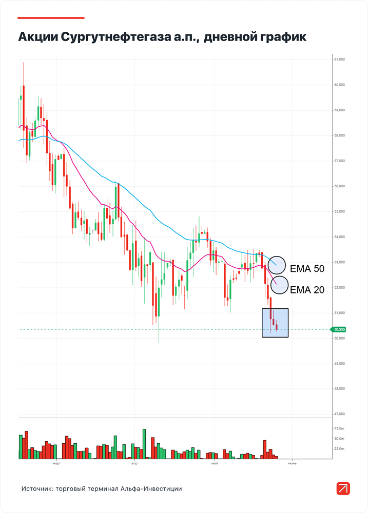Мнение: Альфа-Инвестиции Торговый взгляд на акции Сургутнефтегаза Торговый план • Продажа (шорт): привилегированные акции Сургутнефтегаза по цене 51,14 руб. • Срок: 2–3 недели • Цели: 50,215 и 49,38 руб. за акцию • Потенциальная доходность: 2,6% Суть идеи На графике формируется паттерн продолжения нисходящей тенденции вниз. Судя по одновременно падающим 20- и 50-дневным EMA, акция находится в среднесрочном нисходящем тренде. Бумага закрывается ниже индикаторов в течение 6 торговых сессий — это подкрепляет уверенность, что падение продолжится. На часовом графике можем наблюдать формирование фигуры продолжения нисходящей тенденции более детально. После импульса от 21 мая были образованы только три точки построения ABC. Необходимо дождаться формирования последней, четвёртой точки, для завершения паттерна. Если же этого не произойдёт, и актив сразу уйдёт ниже точки А, идея станет неактуальной. Если бумага начнёт активно расти с рисовкой точки D, нужно попробовать поймать нестандартную точку входа на уровне 51,14 руб. Она расположена чуть ниже уровня наклонной, параллельной отрезку AC и проведённой через точку B. Если рынок отреагирует на обозначенную точку и не уйдёт выше, то мы получим позицию с коротким стопом и отличным соотношением риска и прибыли. Цель предлагаем разделить на две части: 50,215 и 49,38 руб. При достижении первого значения необходимо закрыть 50% позиции и перенести стоп в безубыток с учётом комиссии, а при достижении второй цены — купить оставшуюся половину. Стоп-заявку можно разместить на уровне 51,465 руб. Ориентируемся на расположение уровня наклонной, параллельной отрезку AC и проведённой через точку B. Если бумага уйдёт выше неё, то это с высокой долей вероятности приведёт к слому технического паттерна и отказу от идеи. Источник: alfabank.ru Автор: Роман Житник Не является индивидуальной инвестиционной рекомендацией. В этом сообщении представлено мнение экспертов инвестиционной компании или банка. Оно предоставляется исключительно для ознакомления и не является рекомендацией для покупки или продажи ценных бумаг, а также для принятия каких-либо коммерческих или других решений. mondiara.com не несёт ответственности за содержание этого сообщения и последствия его использования.
