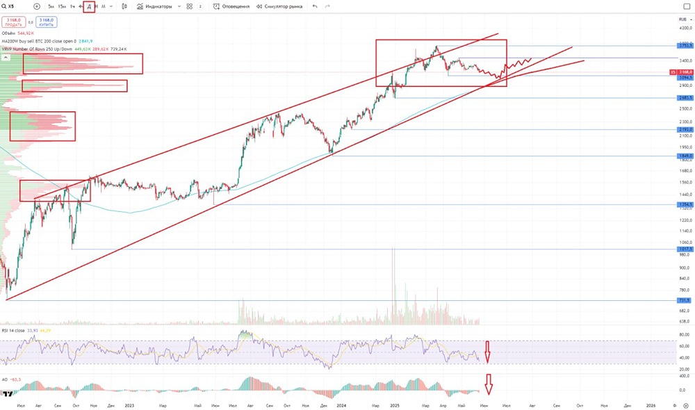 Последний обзор по ИКС 5 делал 18 апреля, тогда акции стоили 3348 р., я ожидал роста до 3750 р., а от туда коррекции к ~3500. По факту акции сначала росли до 3472, а от туда пошли в коррекцию до текущих 3169. Таким образом данный прогноз не оправдался, компанию залили вместе со всем рынком. Давайте посмотрим, чего можно ждать дальше. ℹ️ По метрикам ИКС 5 оценивается плюс-минус, как и в прошлом обзоре, несмотря на падение котировок. Вышел отчет за 1КВ2025, его я и разберу. 💰 Финансовое здоровье ▪️Собственный капитал за 1КВ2025ТТМ вырос на 3% ▪️Чистый долг за 1КВ2025ТТМ вырос на 5% ▪️Net Debt / EBITDA — 2.31. Уровень долговой нагрузки средний, он вырос по сравнению с итогами 2024 года. ℹ️ Финансовое здоровье хорошее, не идеальное, но и не проблемное. 💰 Выручка, прибыль ▪️Выручка за 1КВ2025ТТМ выросла на 5%. ▪️Прибыль за 1КВ2025ТТМ упала на 4%. ▪️Свободный денежный поток упала на 34% за 1КВ2025ТТМ. 🔮 Будущее, оценки ▪️ Есть три свежие оценки. Первая от 18 апреля от БКС — 3900 р. Вторая от 5 мая от Альфа-Инвестиции — 4100 р. Третья от 6 мая от Сбер Инвестиций — 4500 р. 🤵♂️ Основные акционеры 47,9% — CTF Holdings S.A. 11.4% — Intertrust Trustees Ltd 🆚 Сравнение с конкурентами Крупнейшая по капитализации компания в секторе. По метрикам оценивается средне по рынку. По уровню долговой нагрузки в среднем по рынку. По метрикам рентабельности лучше рынка. По росту выручки в среднем по рынку. В моем рейтинге лучших компаний в секторе магазинов и интернет-магазинов, ИКС 5 занял первое место. 🤑 Дивиденды Последний раз платили в 2021 году. В июле 2025 ожидается выплата 648 р. на акцию или около 20% 📈 Технический анализ Судя по всему цена стремится дойти до ближайшего уровня поддержки ~3100. Индикаторы на дневном ТФ предполагают продолжение движение вниз, но как минимум в ближайшее время стоит ждать отскока, так как находимся в зоне перепроданности. Как я вижу ближайшие движения отобразил на графике. 🧠 Выводы За 1 квартал 2025 года упала прибыль на 4%, а также сократился денежный поток на 34% — это основные проблем по отчету. Выручка продолжает расти. Уровень долга приемлемый. Дивиденды высокие. В целом у компании выглядит всё вполне хорошо. Падает заодно вместе с рынком. Тут те же самые истории сработают: понижение процентной ставки и перемирие. Увидим это — начнется новый цикл роста. До тех пор либо лёгкое нисходящее движение либо боковик. Данный материал носит информационный характер и не является индивидуальной инвестиционной рекомендацией или предложением о покупке или продаже указанной ценной бумаги.