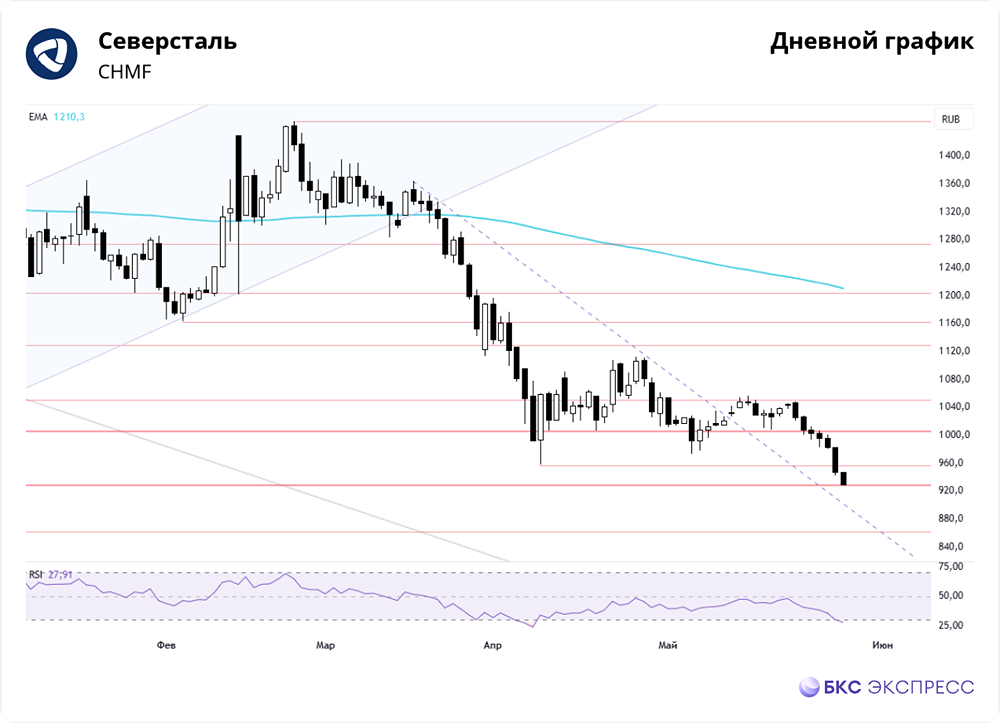 Мнение: БКС Экспресс Двухлетние минимумы достигнуты В понедельник, 26 мая, акции «Северстали» упали на 3,52%, завершив день на отметке 947,6 рубля. Объём торгов составил 0,88 млрд рублей. Сегодня, на утренней сессии, акции продолжают снижаться, теряя 1,7%, и держатся на уровне 932 рубля. Краткосрочный прогноз В течение прошлой недели акции «Северстали» демонстрировали снижение, завершив её на минимумах с начала мая. В понедельник падение ускорилось: сначала котировки обновили минимумы текущего года, а затем и двухлетние минимумы. Ситуация на рынке стали остаётся сложной. Накануне министр финансов Антон Силуанов сообщил, что электрометаллурги не будут платить акциз на сталь за апрель из-за низких цен на металл. Однако это не относится к публичным сталелитейным компаниям, таким как «Северсталь», НЛМК и ММК, которые используют доменно-конвертерный способ выплавки стали. Послабления для электрометаллургов не гарантируют аналогичного шага для доменно-конвертерного производства, учитывая, что рентабельность первого в 2–3 раза ниже. На утренней сессии акции показывают отрицательную динамику. Если тенденция сохранится, то ближайшей поддержкой станет уровень 910 рублей — это максимум конца 2022 — начала 2023 года. Чуть ниже 900 рублей находится граница локального нисходящего тренда. Если акции уйдут под эти уровни, то это увеличит риск снижения до минимумов 2023 года на уровне 860 рублей. На дневном графике RSI находится в зоне перепроданности, что увеличивает вероятность отскока. В случае разворота ближайшей целью станет возвращение выше недавних минимумов года, на уровень 958 рублей. Затем цель сместится в район 1005–1007 рублей — это нижняя граница боковика, в котором акции торговались почти полтора месяца, а также 200-дневная скользящая средняя. Закрепление выше откроет путь к верхней границе зоны консолидации на уровне 1065 рублей с промежуточным препятствием на уровне 1054 рублей. Внешний фон В понедельник биржи США были закрыты, так как в стране был национальный выходной. Фьючерс на индекс S&P 500 в начале торгов растёт на 0,9%. Азиатские фондовые индексы демонстрируют негативную динамику: японский Nikkei снижается на 0,1%, гонконгский Hang Seng и китайский Shanghai Composite теряют 0,2% и 0,3% соответственно. Цена нефти Brent утром снизилась на 0,3%, до 64,5 долларов за баррель. Уровни сопротивления: 958 / 1007 / 1054 Уровни поддержки: 910 / 893 / 860 Долгосрочный прогноз В прошлом году акции «Северстали» достигли минимума на уровне 1005,4 рубля. Решение Центрального банка России оставить ставку без изменений в декабре помогло котировкам отскочить и выйти из среднесрочного нисходящего тренда, который начался в середине июня. Оптимизм, вызванный перспективами урегулирования конфликта на Украине, привёл к росту акций в конце февраля до уровня 1500 рублей. Однако этот рост был полностью нивелирован, и котировки обновили минимумы 2024 года, а затем и минимумы с мая 2023 года. С начала 2024 года акции потеряли в цене 15–20%, а торговые ограничения США против Китая могут ещё больше снизить внутренний спрос на сталь и, следовательно, на металлургический уголь и железную руду, что окажет значительное давление на котировки. Мы понизили целевую цену акций «Северстали» до 1000 рублей. Кроме того, компания ожидает рекордных капитальных затрат, что может привести к снижению денежного потока и, как следствие, дивидендов. И