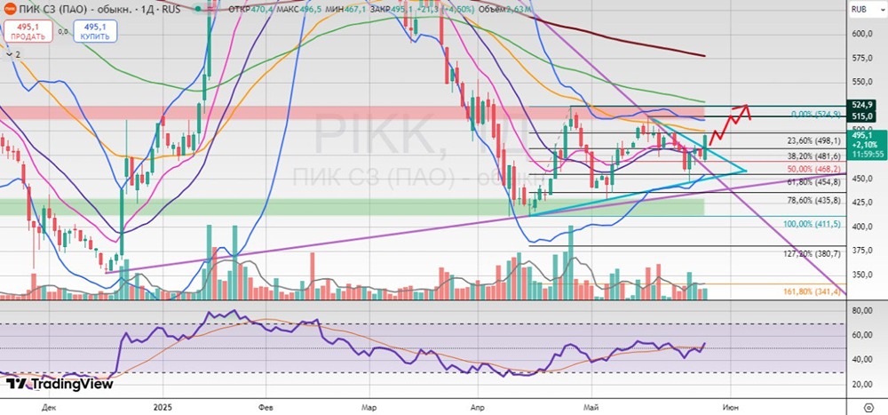 #pikk (ПИК - Д) Среднесрок. ✒️ Актив преодолел контртрендовую линию (сиреневый цвет) и локальный симметричный треугольник (бирюзовые линии), подтверждая сигналы на покупку. Цены движутся вверх к 50 EMA (золотая скользящая средняя). На общем отскоке рынка ожидаем реакцию. Возможен бычий сценарий: закрепление выше 13 EMA (розовая скользящая средняя) и медианы BB (фиолетовая линия) на уровне 38,2% Фибоначчи (примерно 483). Это может привести к росту котировок до локальных экстремумов (тёмно-зелёные линии). Цель роста отмечена красной стрелкой. Если цены опустятся ниже 464, идея будет отменена. Объёмы покупок увеличиваются. RSI находится в зоне интереса покупателей. 🔔 Вход: закрепление выше 483; 🏆 Тейк: 514.5; 524.5 ⛔️ Стоп: свой, исходя из своей стратегии Данный материал носит информационный характер и не является индивидуальной инвестиционной рекомендацией или предложением о покупке или продаже указанной ценной бумаги. Источник: t.me/UHBECTUPYEM_BbIrODNO
