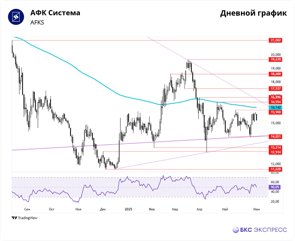 Мнение: БКС Экспресс Ожидается сложная неделя для бумаг АФК Системы В пятницу акции АФК Система продемонстрировали рост стоимости на 2,69%. К закрытию торгов цена составила 15,651 руб. Торговый объём был ниже среднего и составил 1,22 млрд руб. Сегодня утром бумаги продолжают расти в цене, прибавив 1,4%. Краткосрочные перспективы В пятницу акции АФК Система уверенно росли в цене, несмотря на снижение торговой активности. В этот день на рынке наблюдался общий рост российских акций. По итогам основной сессии индекс МосБиржи вырос на 0,67%, а с учётом вечерней сессии — на 1,3%. В течение всего торгового дня акции АФК Система демонстрировали стабильный рост. Однако на выходных динамика была отрицательной, и весь пятничный прирост был потерян. Основной причиной снижения стали атаки на российские объекты, что создало риски срыва сегодняшних переговоров в Стамбуле. Однако переговоры всё же состоятся, что может стать позитивным фактором для акций в начале торгов. Впереди акции столкнутся с важным уровнем сопротивления в виде 200-дневной скользящей средней. Если переговоры пройдут успешно, то есть все шансы на преодоление этого уровня. В противном случае акции могут откатиться до 14 руб. или даже ниже, к зоне декабрьского восходящего тренда, до 13,5 руб. Ещё одним важным событием станет заседание ЦБ РФ по ключевой ставке, которое состоится в пятницу. Акции АФК Система являются одними из наиболее чувствительных к изменениям ключевой ставки, поэтому их рост может быть наиболее заметным. Однако есть и риски. В пятницу индекс МосБиржи смог отыграть падение предыдущего торгового дня. Сегодняшний день имеет большое значение для российского рынка, поскольку при положительном закрытии может быть пробит нисходящий февральский тренд, и положительная динамика может ускориться. Ситуация на мировых рынках Индекс S&P 500 в пятницу снизился на 0,01%, фьючерс утром также в минусе на 0,5%. Индексы Азиатско-Тихоокеанского региона также демонстрируют снижение. Фьючерс на нефть Brent на Московской бирже в пятницу снизился на 0,14%, а на мировых рынках утром наблюдается рост на 2,5%, цена за баррель составляет 64,2 доллара. Уровни сопротивления: 15,96 / 16,89 / 17,53. Уровни поддержки: 14,02 / 13,214 / 11,628. Долгосрочные перспективы Глобальная динамика акций определяется пологим восходящим трендом, который начался в декабре 2014 года. Именно этот тренд стал опорой для акций во время коррекции, которая началась в мае 2024 года. С апреля 2021 года наблюдается долгосрочный нисходящий тренд. С исторического максимума, который служит основой для этого тренда, акции потеряли около 60%. Ближайшей среднесрочной целью является возвращение к майскому нисходящему тренду, который проходит около 17,5 руб. Для этого необходимо преодолеть 200-дневную скользящую среднюю. По итогам прошлой недели был получен умеренно позитивный технический сигнал. Закрытие было похоже на свечу «Доджи». Ранее наблюдалась нисходящая динамика, но она не получила дальнейшего развития. При этом основное снижение на прошлой неделе пришлось на выходные, что сглаживает эффект коррекции. Аналитики БКС оценивают перспективы акций АФК Система как нейтральные и прогнозируют целевую цену в 19 руб. в течение следующих 12 месяцев. Источник: bcs-express.ru Автор: Решетников Олег В этом сообщении представлено мнение экспертов инвестиционной компании или банка. 