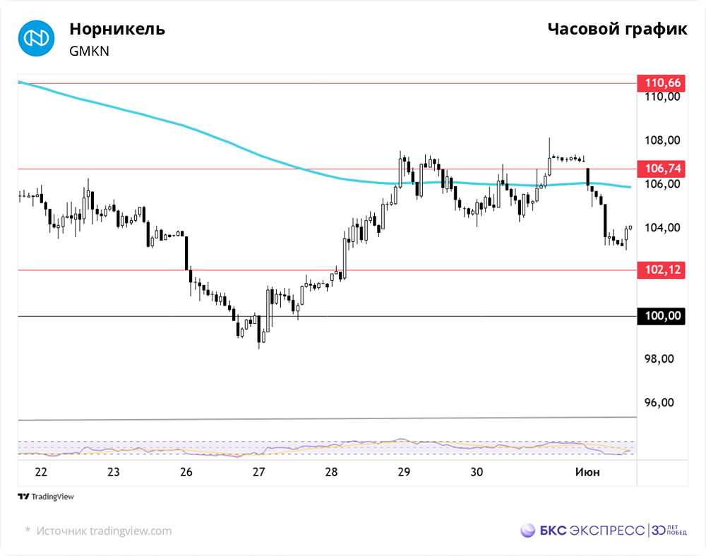 Мнение: БКС Экспресс Падение на уровень нижней планки В пятницу акции «Норникеля» продемонстрировали рост на 1,51%, достигнув отметки в 106,42 рубля. Однако в выходные дни бумаги потеряли 2,99%, опустившись до уровня 103,24 рубля. Объём торгов в пятницу был относительно небольшим и составил 1,49 миллиарда рублей. Сегодня утром акции продолжили рост, прибавив 0,7% по сравнению с закрытием торгов в воскресенье. Краткосрочный анализ показывает, что бумаги умеренно росли и закрылись примерно в плюсе, как и рынок в целом. Индекс МосБиржи преимущественно демонстрировал положительную динамику. В результате основной сессии бенчмарк вырос на 0,67%, а на вечерних торгах его рост составил 1,3% по сравнению с закрытием четверга. В начале основной сессии был найден ориентир для роста. Акции демонстрировали умеренный рост на утренних торгах, но уже в первые часы основной сессии их цена резко выросла. После отката к уровню четверга бумаги снова начали расти и закрылись недалеко от максимума основной сессии. Уровень сопротивления 106,7 стал техническим препятствием для роста. Котировки замедляли рост вблизи этого уровня как на основной, так и на вечерней сессии. В субботу уровень был преодолен, но на следующий день произошла значительная коррекция, не связанная с техническими факторами. Объём торгов в пятницу был выше, чем в четверг, что было необычно для конца недели и указывало на позитивные настроения участников рынка. В субботу акции продолжили расти, но в воскресенье появились причины для резкого изменения настроений. Бумаги достигли уровня снижения на повышенных объёмах. Важно отметить, что сценарий с отменой переговоров не реализовался, что приведёт к частичному восстановлению потерь воскресенья. На 4-часовом, дневном и недельном таймфреймах RSI приближается к 40 пунктам. Котировки тестируют 200-часовую скользящую среднюю, но пока остаются ниже EMA 200 на других графиках. На мировых рынках в пятницу не удалось развить отскок, и S&P 500 закрылся на уровне четверга. Фьючерс на S&P 500 снизился на 0,3%. Индексы Азиатско-Тихоокеанского региона преимущественно демонстрируют снижение. На мировых рынках с утра цена нефти марки Brent выросла на 1,1%, достигнув $64,3 за баррель. Уровни сопротивления: 106,7 / 110,7 / 116,1 Уровни поддержки: 102,1 / 100 / 95 Долгосрочная картина В феврале 2021 года началась коррекция от исторических максимумов, которая переросла в долгосрочный нисходящий тренд. С тех пор котировки потеряли более 60% от своих максимальных значений. В апреле 2025 года растущий пологий тренд, начавшийся в январе 2009 года, был пробит на фоне обострения торговой войны. Следующий пологий тренд проходит через минимум декабря 2025 года на уровне 95. В конце марта 2025 года бумаги закрепились ниже 200-дневной скользящей средней цены. Долгосрочная техническая картина остаётся негативной, отражая ухудшение ситуации на рынках ключевых металлов, отказ от дивидендов и высокие процентные расходы. Среднесрочная цель — сохранить восходящую динамику, которая началась в 2009 году. После выхода из нисходящего канала бумаги не смогли продолжить более крутой восходящий тренд, начавшийся в 2009 году. Среднесрочное условие для возобновления роста — возврат к 200-дневной скользящей средней. Аналитики БКС прогнозируют целевую цену на уровне 100 рублей в течение года, что предполагает снижение стоимости бумаг примерн