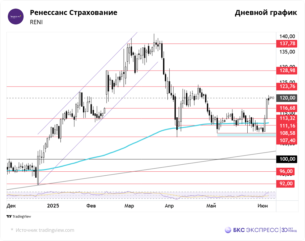 Мнение: БКС Экспресс Почему акции «Ренессанс Страхование» достигли максимума с конца апреля и что ждать дальше Акции компании «Ренессанс Страхование» во вторник продемонстрировали рост на 5,38%, достигнув отметки в 119,56 рублей. Объём торгов был выше среднего и составил 272,5 миллиона рублей. Однако утром в среду бумаги снизились на 0,1% относительно закрытия предыдущего дня. Краткосрочный анализ С начала недели акции компании выросли примерно на 10%. Индекс МосБиржи в основном демонстрировал положительную динамику. По итогам основной сессии бенчмарк вырос на 0,16%, а на вечерних торгах прибавил 0,7% по сравнению с закрытием понедельника. Акции достигли максимума с конца апреля. Во вторник наблюдалась неравномерная восходящая динамика с характерным распределением торговой активности. Основная часть роста, около 2,6%, пришлась на основную сессию. На утренних и вечерних торгах котировки прибавили до 1,5%. Опорным уровнем для разворота текущей недели стала верхняя граница зоны поддержки 107,4–108,6, которая поддерживала котировки с конца мая. С понедельника бумаги преодолели несколько уровней сопротивления. На данный момент акции приблизились к цене первичного размещения и замедлили рост вблизи отметки в 120 рублей. Разворот происходит на фоне увеличения торговой активности. Участники рынка активно наращивают позиции в преддверии пятничного заседания Центрального банка Российской Федерации. Из-за относительно низкой ликвидности бумаг всплески активности приводят к значительным колебаниям котировок. В связи с этим рост активности можно рассматривать как умеренный позитивный сигнал. Индекс относительной силы (RSI) на часовом и 4-часовом таймфреймах находится в зоне перекупленности. На дневном графике индекс достигает 64 пунктов. Котировки вернулись выше экспоненциальной скользящей средней на всех временных интервалах. Внешний фон В понедельник индекс S&P 500 вырос на 0,58%. Фьючерс на S&P 500 снизился на 0,1%. Индексы Азиатско-Тихоокеанского региона в основном демонстрируют положительную динамику. На мировых рынках утром цены на нефть марки Brent снизились на 0,2%, достигнув отметки в 65,5 доллара за баррель. Уровни сопротивления: 120, 123,8, 129. Уровни поддержки: 116,7, 113,3, 111,2. Долгосрочная перспектива В октябре 2021 года «Ренессанс Страхование» провела первичное размещение акций по цене 120 рублей за акцию. В тот же день был достигнут исторический максимум, который составил около 150 рублей. С февраля 2022 года акции компании следуют восходящему тренду. В декабре 2024 года бумаги использовали этот тренд в качестве основы для формирования трёхмесячного восходящего канала. За это время котировки выросли более чем на 53% от минимальных значений декабря. В конце марта 2025 года бумаги преодолели восходящий канал и начали стремительную коррекцию. За две недели котировки снизились примерно на 22%. Акции остановились в падении вблизи 200-дневной скользящей средней после отскока от уровня поддержки 107,4. Предыдущая коррекция вновь встретила поддержку в виде EMA 200. Это предотвратило падение ниже апрельских минимумов и создало технические условия для разворота. Среднесрочное условие для роста котировок — закрепление выше 200-дневной скользящей средней. Источник: bcs-express.ru Автор: Смирнов Андрей В этом сообщении представлено мнение экспертов инвестиционной компании или банка. Оно 