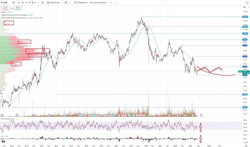 Последний обзор по АЛРОСА я делал 29 апреля. Тогда акции стоили 50,4 рубля. Я отметил, что компания выглядит слабее рынка, у меня был нейтральный взгляд на её перспективы, а график акций ожидался в боковике 50–55 рублей. Однако акции вместе с рынком упали на негативных ожиданиях инвесторов до 44 рублей, а сейчас торгуются по 47,2 рубля. Посмотрим, что будет дальше. Основные метрики - Капитализация: $4,34 млрд. - P/E: 16,25. - P/S: 1,41. - P/B: 0,93. - EPS: 2,87 рубля. - EBITDA: 77,7 млрд рублей. - EV/EBITDA: 5,91. По сравнению с прошлым обзором акции стали немного дешевле по метрикам. Отчёт за первый квартал 2025 года ещё не вышел. Финансовое здоровье - Собственный капитал в 2024 году упал на 3 %, а в 2023 году вырос на 18 %. - Чистый долг в 2024 году вырос на 17 %, а в 2023 году — на 26 %. - Net Debt / EBITDA — 1,49, а в 2023 году был 0,72. Долговая нагрузка умеренная, но заметно выросла. Собственный капитал немного вырос, но долговая нагрузка увеличилась. Финансовое здоровье компании можно назвать нормальным, но не отличным. Выручка и прибыль - Выручка в 2024 году упала на 25 %, а в 2023 году выросла на 9 %. - Прибыль обвалилась в 2024 году на 77 %. В 2023 году она упала на 15 %. - Свободный денежный поток в 2024 году упал на 907 % до минус 17,6 млрд рублей. Будущее и оценки - 20 марта 2025 года АКБФ-Инвестиции давали прогноз 85,02 рубля. - 28 февраля 2025 года Альфа-Инвестиции прогнозировали 68 рублей. Основные акционеры - Федеральное агентство по управлению государственным имуществом — 33 %. - Министерство имущественных и земельных отношений Республики Саха (Якутия) — 25 %. - Администрации районов (улусов) Республики Саха (Якутия) — 8 %. Сравнение с конкурентами В России нет других алмазных компаний, поэтому я сравниваю АЛРОСА с компаниями из группы «Металлы и сырьё». По капитализации компания входит в топ-10 сектора. По текущим метрикам она оценивается дороже рынка, но по рентабельности и росту выручки уступает ему. Дивиденды - 2020 год: 3,99 %. - 2021 год: 13,5 %. - 2022 год: не платил. - 2023 год: 4,9 %. - 2024 год: 7,16 %. Компания прекратила выплаты дивидендов. Технический анализ Ожидаю боковик или небольшое движение вниз. В моменте возможен рост, но это временный позитив, связанный с ситуацией на рынке. Пока у компании нет хороших новостей по отчётам. Вероятно, отчёты за первый и второй кварталы будут не лучше. Позитивную динамику можно ждать с третьего квартала. Выводы Акции АЛРОСА сейчас стоят по самым низким ценам за последние годы, но я бы не торопился их покупать. Отчёт за 2024 год слабый, и отчёты за первый и второй кварталы, скорее всего, тоже будут не блестящими. Ситуация в компании вряд ли улучшится при перемирии, если только не отменят санкции. Этот процесс, вероятно, будет не быстрым. Пока лучше оставаться в наблюдательной позиции. В прошлом компания была эффективной, но сейчас на неё влияют геополитика и слабость рынка бриллиантов. Данный материал носит информационный характер и не является индивидуальной инвестиционной рекомендацией или предложением о покупке или продаже указанной ценной бумаги. Источник: t.me/ShumilovPavel