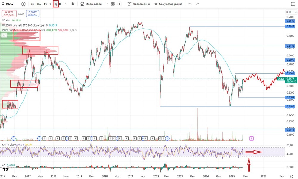 Последний обзор ОГК-2 был 31 октября 2024 года. Тогда акции стоили 0,333 рубля, и я ожидал падения на 16% до 0,2785. После этого я ждал отскока. На деле акции падали до 0,275, а затем начался отскок. Он был достаточно существенным: акции выросли до 0,425. Сейчас они торгуются по 0,398 рубля. Давайте посмотрим, как дела у компании, и что можно ожидать дальше. Основные метрики - Капитализация: 703 миллиона долларов. Здесь возникает проблема. Компания не отчитывалась с третьего квартала 2023 года. В прошлом обзоре я анализировал старые данные. С тех пор отчётов не было. Я могу лишь кратко описать данные последнего отчёта, изучить новости и проанализировать график. Однако эта информация будет не очень надёжной, так как отчётов не было почти два года. Это тревожный сигнал. Финансовое здоровье, прибыль, выручка Полных отчётов нет с третьего квартала 2023 года, но я могу использовать данные за тот период. Выручка выросла на 17% в 2023 году по сравнению с 2021. Прибыль упала на 53%. Будущее, оценки Прогнозов нет. Основные акционеры - 73,4% принадлежит ПАО «ЦентрЭнергоХолдинг» (владелец — Газпром). - 7,5% принадлежит ООО «Газпром Энергохолдинг» (владелец — Газпром). Сравнение с конкурентами По данным отчёта за девять месяцев 2023 года по P/E компания стоит дороже отрасли. По P/S и P/B — в среднем по отрасли. Данные по долговой нагрузке не публикуются с 2021 года. По метрикам рентабельности компания оценивается ниже своей отрасли. Рост выручки за пять лет хуже отрасли. Дивиденды Последние годы компания выплачивала дивиденды от 6% до 8%. В 2022 году выплатила 14,4%. В 2024 году выплат не было. На 2025 год компания запланировала выплаты 14,97%, вероятно, сразу за два года. Технический анализ После роста на 18% за несколько дней акции компании находятся в зоне перекупленности по некоторым индикаторам. Это может ограничить потенциал роста. Мы можем дойти до ближайшего уровня сопротивления — 0,426. Акции выше 200-дневной скользящей, что является бычьим сигналом. Я вижу дальнейшее движение на графике. Выводы Инвестировать в ОГК-2 сейчас рискованно. Нормальных отчётов нет с третьего квартала 2023 года. Данных по долгам нет с 2021 года. В таких условиях инвестировать нельзя. Данный материал носит информационный характер и не является индивидуальной инвестиционной рекомендацией или предложением о покупке или продаже указанной ценной бумаги. Источник: t.me/ShumilovPavel