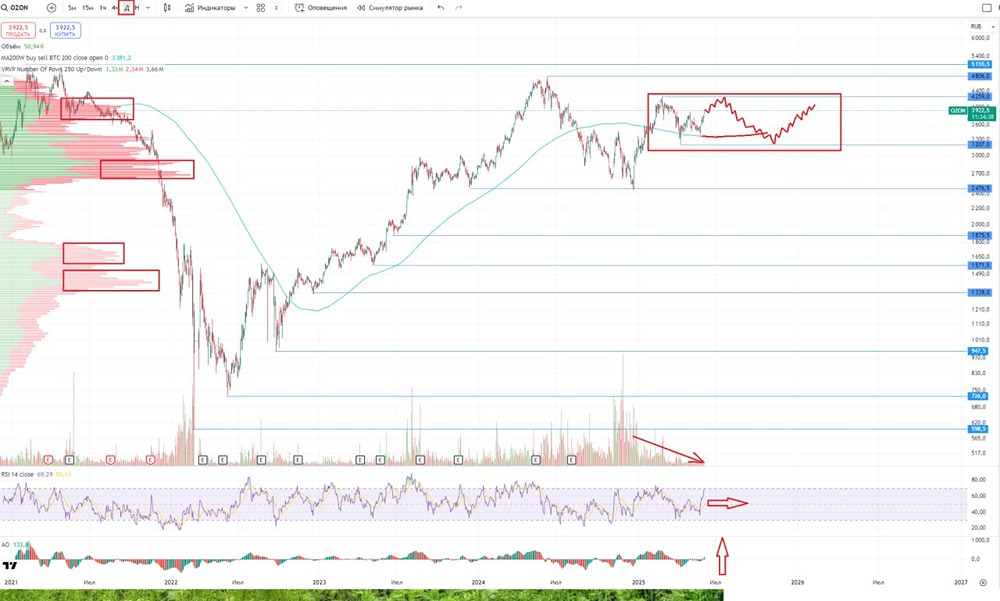 Обзор по компании Ozon #OZON Последний обзор по Ozon я делал 28 февраля. С тех пор никто не просил разобрать его, поэтому я решил включить его в текущий анализ. Последний раз акции Озона стоили 4200 рублей. Я ожидал коррекции до уровня около 3450 рублей, а затем роста до 4200 и 4800 рублей и выше, если бы конфликт прекратился и процентные ставки начали снижаться. В действительности акции упали до 3215 рублей, после чего начался рост до 3900 рублей. Пока они не достигли ожидаемых мной 4200 рублей и выше, но ставку не снизили, а конфликт продолжается. Сейчас акции торгуются по 3915 рублей. Посмотрим, что будет дальше. Основные метрики: - Капитализация: 10,15 млрд долларов. - P/E (отрицательное значение): компания традиционно убыточна. - P/S: 1,15. - P/B (отрицательное значение): убыточность сохраняется. - EPS: минус 260,03 рубля. - EBITDA: 62,3 млрд рублей. - EV/EBITDA: 12,85. Компания традиционно убыточна, но убытки немного сократились. Это хорошо, но важно, чтобы эта тенденция стала устойчивой и компания начала приносить прибыль. Недавно вышел отчет за первый квартал 2023 года, который я разберу. Финансовое здоровье: - Собственный капитал за первый квартал 2023 года показал отрицательное значение и сократился на 6% до минус 140,7 млрд рублей. - Чистый долг за первый квартал 2023 года вырос на 160% до 1,25 млрд рублей. - Net Debt / EBITDA: 0,02. Долговая нагрузка минимальна для компании. Уже шесть лет собственный капитал компании падает, уходя в глубокий минус. Финансовое состояние компании слабое в классическом понимании. Однако компания развивается по нестандартной модели. Выручка и прибыль: - Выручка за первый квартал 2023 года выросла на 13%. - Прибыль (точнее, убыток) сократился на 9% до минус 54,17 млрд рублей. - Свободный денежный поток вырос на 13% до 244,68 млрд рублей. Будущее и оценки: - 2 июня Альфа-Инвестиции установили целевой уровень в 4700 рублей. Старые оценки от июня 2024 по ноябрь 2024 года варьировались от 4305 до 5350 рублей. Свежих оценок немного. Сравнение с конкурентами: Можно сравнить Ozon с М.Видео и ВсеИнструменты. Ozon — крупнейшая компания по капитализации. По метрикам, как и другие, она убыточна, но по P/S дороже сектора. По долговой нагрузке компания лучше сектора. По рентабельности она находится на среднем уровне по сектору. По росту выручки за пять лет Ozon лучше рынка. Дивиденды: Выплат пока не было. Технический анализ: Ожидаю боковик. В данный момент индикаторы говорят о перекупленности. Небольшое повышение возможно, но, вероятно, оно будет ограничено уровнем сопротивления около 4260 рублей, после чего ожидается коррекция. В итоге на несколько месяцев мы можем остаться в боковике 3000–4200 рублей (в лучшем случае). Если конфликт продолжится и процентные ставки не будут снижаться, мы можем выйти из этого боковика и опуститься ниже, например, до 2500 рублей. Выводы: Отрицательный собственный капитал продолжает расти. Я традиционно не рекомендую инвестировать в такие компании, хотя модель компании отличается от классических историй. Из плюсов можно отметить сокращение убытков и положительный свободный денежный поток. Вероятно, компания постоянно работает в убыток из-за инвестиций в развитие. Выручка также постоянно и существенно растёт, что является положительным моментом. Я бы рассмотрел инвестиции в Ozon, если сокращение убытков станет новым трендом и падение собственного капитала прекратится. Посмотрим, как будет обстоять дело
