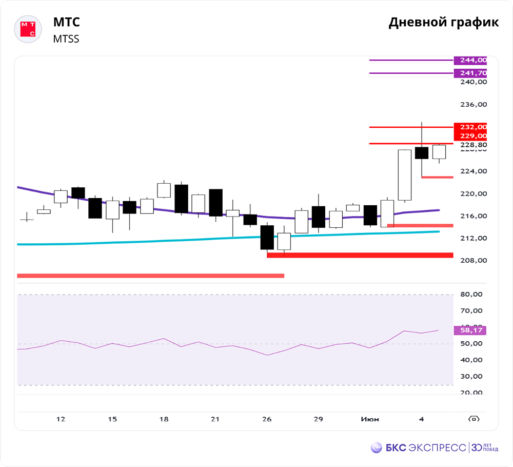 Мнение: БКС Экспресс Преимущества покупки акций МТС: анализ краткосрочных целей и долгосрочных перспектив На прошлой торговой сессии акции МТС подешевели на 0,68%. На закрытии цена составила 226,35 рубля. Бумаги показали худшую динамику по сравнению с рынком. Объём торгов достиг 1,9 миллиарда рублей. Краткосрочный анализ Дневная структура выполнила максимальные цели роста 229–232. Максимум был установлен на уровне 232,9. Пока не было слома отметки 222,85, есть вероятность ускорения подъёма с первыми целями 241,7–244. Эта область близка к зоне максимальных целей в долгосрочной перспективе. Первым сигналом к попытке возобновления роста и обновления максимума 232,9 станет пробитие сопротивления 228,75. Кривая RSI на дневном графике находится на уровне 58 пунктов. На 4-часовом таймфрейме цена выше 50- и 200-дневной скользящих средних. В первую очередь нужно следить за структурой графика и уровнями 232,9 и 214,05. Внешний фон Индекс S&P 500 в среду не изменился, утром он снизился на 0,1%. Индексы Азиатско-Тихоокеанского региона торгуются разнонаправленно. Нефть марки Brent в среду подешевела на 1,17%, утром снижение составило 0,2%. Уровни сопротивления: 228,75 / 232,9 / 239 Уровни поддержки: 214,05 / 208,6 / 198 Долгосрочный анализ На недельном графике сформировались цели роста 228,8–231 и 239–243. На этой неделе первые цели были достигнуты. Пока не было слома поддержки 214,05, возможно продолжение подъёма в следующую зону 239–243. Локальные цели движения рассматриваются в краткосрочной перспективе. Источник: bcs-express.ru Автор: Мамонтов Андрей Не является индивидуальной инвестиционной рекомендацией. В этом сообщении представлено мнение экспертов инвестиционной компании или банка. Оно предоставляется исключительно для ознакомления и не является рекомендацией для покупки или продажи ценных бумаг, а также для принятия каких-либо коммерческих или других решений. mondiara.com не несёт ответственности за содержание этого сообщения и последствия его использования.