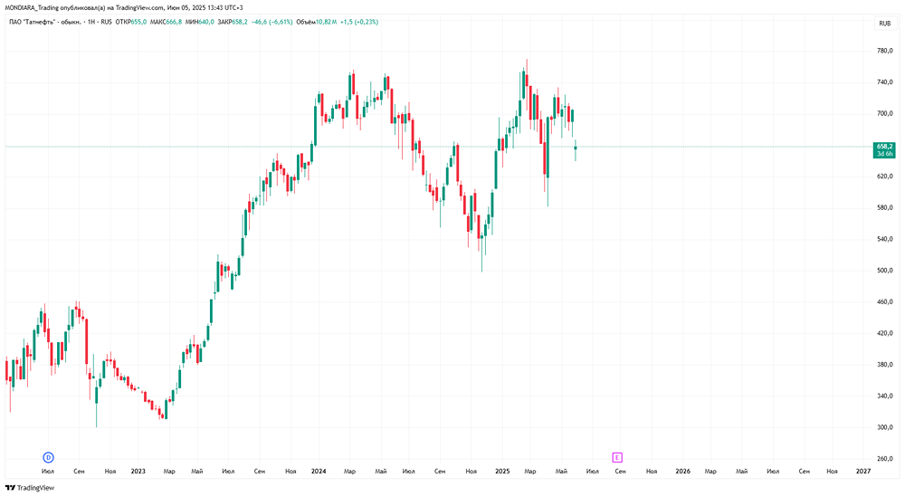 Почему акции «Татнефти» продолжают снижаться в цене? Финансовые результаты компании за первый квартал 2025 года по РСБУ оказались слабыми. Выручка снизилась на 5,4% по сравнению с предыдущим годом и составила 361,4 миллиарда рублей. Это связано с падением цен на нефть и нефтепродукты. Себестоимость, напротив, выросла на 8,1% и достигла 276,6 миллиарда рублей из-за увеличения операционных расходов. Валовая прибыль упала на 32,8% до 84,86 миллиарда рублей, а чистая прибыль сократилась в 1,8 раза, до 37,29 миллиарда рублей. Другие компании в секторе, вероятно, тоже не смогли избежать негативного влияния снижения цен на нефть и укрепления рубля. Татнефть не стала исключением, поэтому акции компании вряд ли будут опережать рынок в ближайшее время. Инвесторам Татнефти есть о чем беспокоиться: падение чистой прибыли по РСБУ может привести к значительному снижению дивидендов по итогам 2025 года. Татнефть обычно платит дивиденды в размере 50% от чистой прибыли, но в периоды благоприятной конъюнктуры может превышать этот порог. Сейчас компания, скорее всего, вернется к этой норме, что может усилить падение дивидендов. В целом, мы смотрим на Татнефть нейтрально. Наш текущий таргет по акциям компании на горизонте года составляет 680 рублей. Источник: Invest Assistance