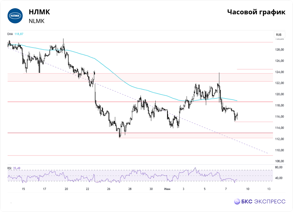 Мнение: БКС Экспресс Что происходит с акциями НЛМК после снижения ключевой ставки ЦБ РФ в июне 2025 года В пятницу, 6 июня, акции НЛМК продемонстрировали снижение на 2,66%, завершив день на отметке 117 рублей. Объём торгов составил 1,49 млрд рублей. На утренних торгах, которые отражают динамику рынка в выходные дни, котировки снизились на 0,3%, оставаясь вблизи отметки 116,6 рубля. Краткосрочная динамика В четверг бумаги НЛМК смогли возобновить рост, а в пятницу, сразу после того как Центральный банк принял решение снизить ключевую ставку до 20%, они достигли максимума с 22 мая и протестировали целевые уровни 122,2–123,8 рубля. Однако дальнейшего роста не произошло, и рынок развернулся вниз, что повлияло и на акции НЛМК. В субботу была попытка отскока, но в воскресенье котировки снова снизились. Мы считаем, что снижение ключевой ставки является позитивным фактором для российского рынка акций, на котором уже три года сохраняется дисконт к историческим оценкам. Однако негативная реакция может быть связана с жёсткими комментариями Центрального банка, которые почти не изменились по сравнению с пресс-релизом апрельского заседания. Более подробный прогноз представлен в специальном материале. На утренних торгах акции сократили потери и снизились на 0,3% по сравнению с пятничными уровнями. Котировки не смогли удержать уровень 188,8 рубля в качестве поддержки, и теперь он стал ближайшим сопротивлением. Закрепление выше этого уровня может вернуть бумаги на позиции до пятничного заседания Банка России и актуализировать цель — диапазон 122,2–123,8 рубля. Чуть выше, на уровне 124,4 рубля, находится EMA 200 на 4-часовом графике. Пробой этого уровня может ускорить рост акций и приблизить их к следующему целевому уровню — 130 рублям. В случае продолжения снижения ближайшей поддержкой станут минимумы выходных, расположенные около 115 рублей. Следующая опора находится на уровне 113,2–112,2 рубля — это минимумы прошлого и текущего годов. Пробой этого уровня откроет путь к дну 2023 года — 108,6 рубля. Внешний фон Индекс S&P 500 завершил торги пятницы с ростом на 1,03%, а фьючерс снизился на 0,2%. Индексы Азиатско-Тихоокеанского региона демонстрируют положительную динамику: японский Nikkei и гонконгский Hang Seng выросли на 1% и 1,1% соответственно, а китайский Shanghai Composite — на 0,2%. Цена на нефть марки Brent утром снизилась на 0,4%, достигнув 66,4 доллара за баррель. Уровни сопротивления: 118,8 / 123,8 / 124,4 Уровни поддержки: 115,1 / 112,2 / 108,6 Долгосрочная перспектива В декабре 2024 года остановка цикла ужесточения денежно-кредитной политики Центрального банка и надежды на улучшение геополитической ситуации придали акциям НЛМК импульс роста и сформировали восходящий тренд. В максимумах 2025 года бумаги достигли отметки 168 рублей. Однако затем, следуя за общей динамикой рынка и неблагоприятной ситуацией на рынке стали, они вернулись к минимальным значениям 2024 года. Наша целевая цена по акциям НЛМК составляет 130 рублей, а прогноз — «Негативный». Компания отказалась от выплаты дивидендов за 2024 год, а ситуация на рынке стали остаётся сложной. Источник: bcs-express.ru Автор: Попова Анастасия В этом сообщении представлено мнение экспертов инвестиционной компании или банка. Оно предоставляется исключительно для ознакомления и не является рекомендацией для покупки или продажи ценных бумаг, а также для принятия каких-либо коммерческих 