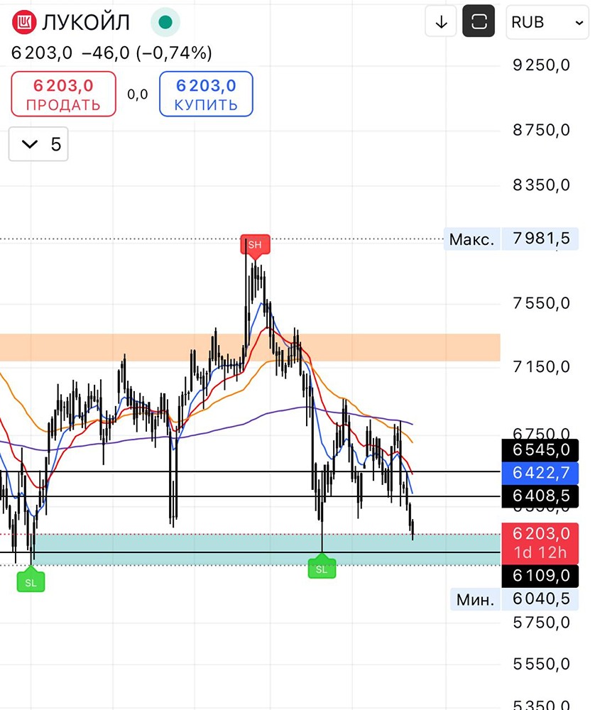 #LKOH Как я и писал вчера, если цена пробьёт уровень 6300, то пойдёт ниже. Сейчас «Лукойл» приближается к зоне загрузки, и было бы хорошо увидеть его ещё на 100–200 рублей ниже, примерно около 6000 рублей. Однако вопрос в том, позволят ли цене упасть до этого уровня. Если вы верите в эту бумагу, можно начинать её покупать по текущим ценам или ниже, до 6000 рублей. Установите стоп-лосс на уровне 5900 рублей. В среднесрочной перспективе мы можем вернуться к значениям 6400–6500 рублей как минимум. Данный материал носит информационный характер и не является индивидуальной инвестиционной рекомендацией или предложением о покупке или продаже указанной ценной бумаги. Источник: Среднесрочные идеи