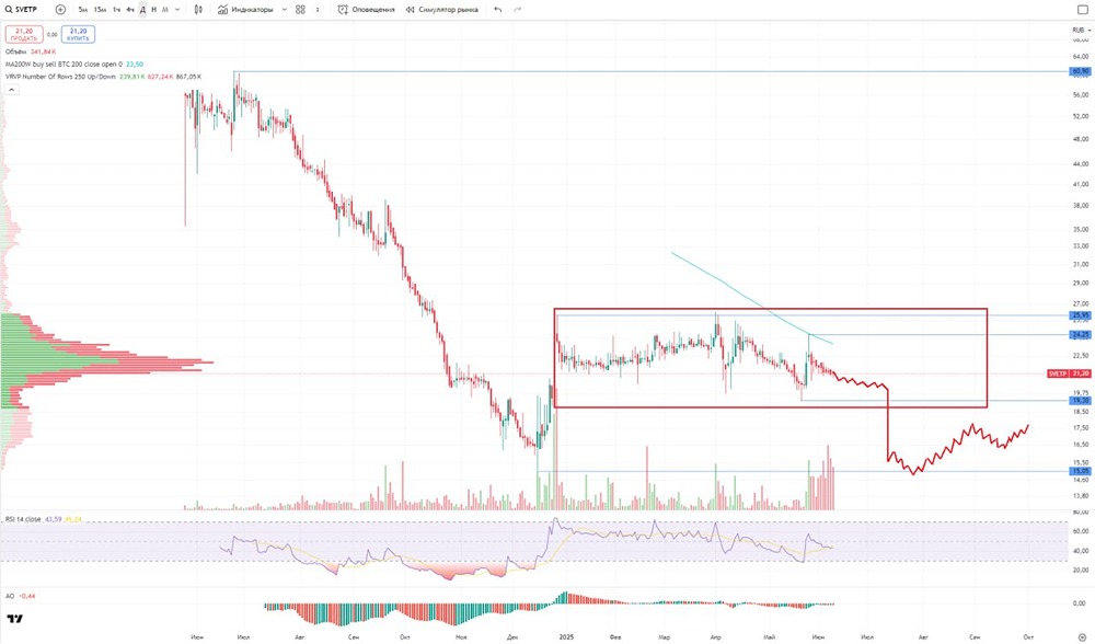 Обзор компании «Светофор». Сейчас торгуются по 12,3 рубля за акцию. Посмотрим, что будет дальше. Основные метрики: - Капитализация: 4,37 млн долларов. Это компания малой капитализации. - P/E: 1,98. - P/S: 0,51. - P/B: 0,77. - EPS: 7,03 рубля. - EBITDA: 225 млн рублей. - EV/EBITDA: 1,83. По сравнению с прошлым обзором акции стали стоить примерно в два раза дешевле по метрикам. Отчёт за 2024 год доступен, и я его разберу. Финансовое здоровье: - Собственный капитал за 2024 год вырос на 111%, а в 2023 году — на 31%. - Чистый долг в 2024 году упал на 44%, а в 2023 году — на 5%. - Net Debt / EBITDA — 0,31. Долговая нагрузка минимальная. Финансовое состояние компании хорошее. Собственный капитал вырос, долги упали, а сами долги незначительны. Выручка и прибыль: - Выручка в 2024 году выросла на 47%, а в 2023 году — на 49%. - Прибыль выросла на 253% в 2024 году, а в 2023 году — на 93%. - Свободный денежный поток упал на 86% и стал отрицательным — минус 100 млн рублей за 2024 год. Будущее и оценки: - Прогнозов нет. Основные акционеры: - 72,9% акций принадлежит Догаеву А. В. Сравнение с конкурентами: - Сравнивать не с кем. Компания оценена очень дёшево рынком, метрики рентабельности высокие, рост выручки за пять лет существенный, а долговая нагрузка минимальная. Дивиденды: - По привилегированным акциям #SVETP планируют выплатить 7 июля 19,95% годовых. Это неплохо! В 2024 году выплатили 8,18% годовых. По обычным акциям #SVET дивидендная доходность составляет 0,76%, или 0,1 копейки на акцию. Технический анализ: - Учитывая информацию о дивидендах, разберу #SVETP, а не #SVET. С начала 2025 года акции двигаются в боковике. В июле акции упадут на 20–22% в район 15–15,5 рублей на дивидендном гэпе. Я думаю, что после этого они ещё какое-то время будут падать, а затем начнут попытку закрыть гэп. Это будет не быстрый процесс, а вопрос на 3–6 месяцев. Мои предположения по движению акций #SVETP я отобразил на графике. Выводы: - «Светофор» — это своего рода шаурмичная с бонусом. В 2024 году бизнес компании был успешным. Если бы не размер компании, её стоило бы купить. Но сейчас она оценивается как небольшой ресторан в центре Москвы или Санкт-Петербурга, и отношение к ней соответствующее. Это микробизнес, который растёт и даже платит дивиденды. Можно инвестировать небольшую сумму, например, две чашки кофе. Но вкладывать сюда 5 тысяч рублей — это уже перебор. Дивиденды выглядят заманчиво, но это супер-мелкая и неликвидная компания с соответствующими проблемами. Важно помнить, что данный анализ не является индивидуальной инвестиционной рекомендацией. Источник: Павел Шумилов