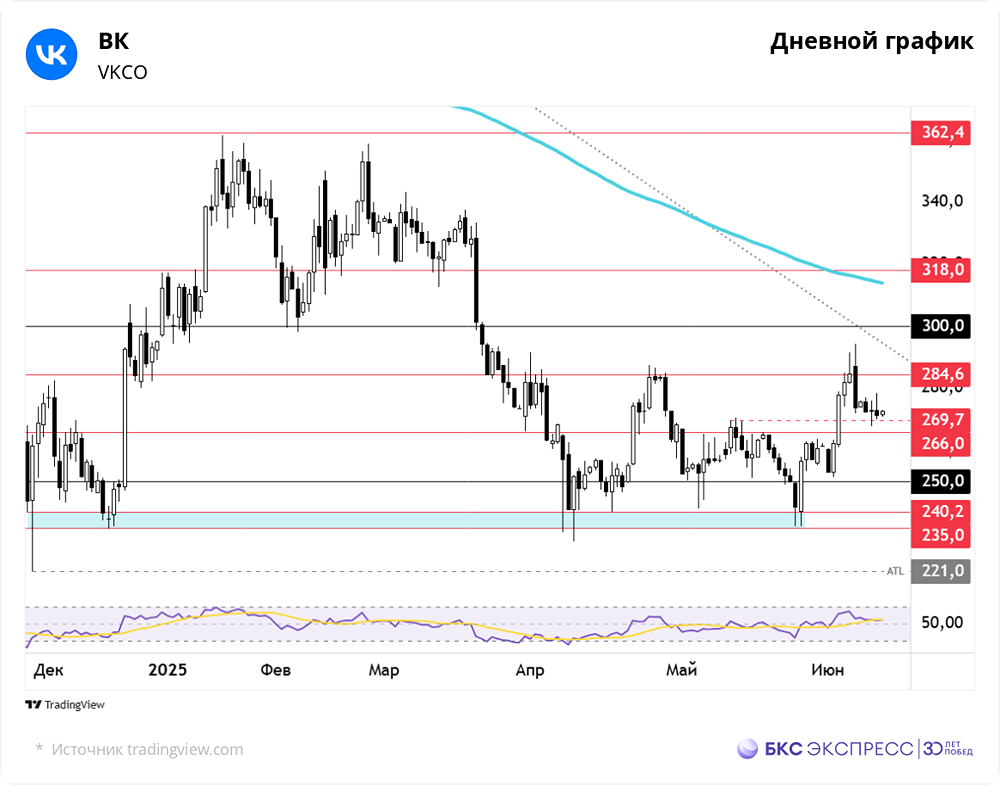 Мнение: БКС Экспресс Влияние решения Банка России по ключевой ставке на акции «ВКонтакте» В начале недели акции «ВКонтакте» показали снижение на 0,48%, достигнув отметки в 271,4 рубля. Объём торгов был ниже среднего и составил 705 миллионов рублей. Сегодня утром бумаги снизились на 0,2% относительно закрытия предыдущего дня. Краткосрочная динамика Акции демонстрируют умеренное снижение на фоне общей тенденции рынка. Индекс Московской биржи в основном снижался. По итогам основной сессии бенчмарк потерял 0,56%, а на вечерних торгах снижение составило 1,35% относительно закрытия понедельника. В начале сессии котировки демонстрировали рост более чем на 2%, но на фоне усиления негативных настроений на рынке не смогли продолжить рост. К середине основной сессии бумаги начали снижаться, и это снижение продолжалось до конца дня. Покупатели пытались поддержать котировки выше отметки в 271 рубль за акцию, что подтверждается отскоком в середине основной сессии и ростом к концу дня. После консолидации в диапазоне 250–266 рублей в мае акции «ВКонтакте» преодолели верхнюю границу на фоне предстоящего решения Банка России по ключевой ставке. В результате роста котировки начали тестировать сопротивление на уровне 285 рублей, но затем откатились. В настоящее время формируется поддержка вблизи отметки в 270 рублей. По итогам торгов на дневном графике сформировался медвежий пинбар. Объём торгов немного снизился по сравнению с предыдущим днём. Внутридневное распределение указывает на силу продавцов, но при попытках разворота покупатели успешно сдерживают натиск. Индекс относительной силы (RSI) указывает на нейтральную позицию. На большинстве графиков индекс близок к 50 пунктам, но общая тенденция восходящая. Котировки приближаются к скользящим средним за 200 дней на часовом и 4-часовом графиках. Скользящие средние могут стать дополнительной поддержкой для дальнейшего разворота. Внешний фон Индекс S&P 500 во вторник вырос на 0,55%. Фьючерс на S&P 500 снизился на 0,2%. Индексы Азиатско-Тихоокеанского региона в основном демонстрируют рост. На мировых рынках утром цены на нефть марки Brent выросли на 0,2% и достигли 66,7 доллара за баррель. Уровни сопротивления: 285, 300, 318. Уровни поддержки: 270, 266, 250. Долгосрочная перспектива В августе 2023 года началась коррекция после достижения локального максимума. Падение приостановилось к концу 2024 года, но котировки всё ещё не преодолели нисходящий тренд. Акции вновь реагируют на диапазон минимумов 235–240. В конце ноября 2024 года и в апреле 2025 года этот диапазон уже выступал в качестве поддержки для акций. В прошлый раз разворот от этих уровней позволил акциям вырасти примерно на 19% менее чем за месяц. С мая 2024 года котировки закрепились ниже 200-дневной скользящей средней. Возвращение к этому уровню является среднесрочной целью. Акции «ВКонтакте» имеют тенденцию к более сильным движениям по сравнению с рынком. Бумаги чувствительны к изменениям процентных ставок из-за низкой рентабельности бизнеса. Кроме того, существует риск увеличения количества акций из-за дополнительной эмиссии. Эти факторы усиливают волатильность котировок. Аналитики БКС прогнозируют рост стоимости акций до 300 рублей в течение года. Это предполагает рост стоимости примерно на 11% от текущего уровня. Прогноз по акциям «ВКонтакте» нейтральный. Источник: bcs-express.ru Автор: Сми