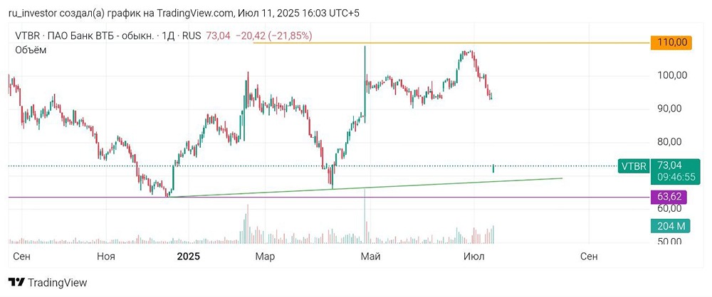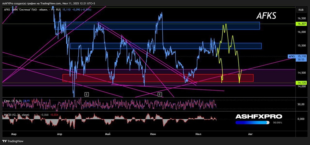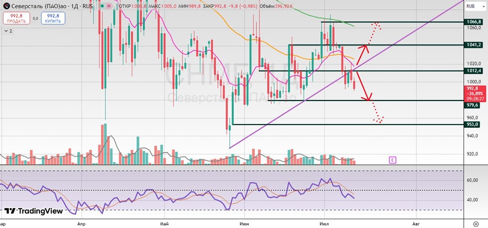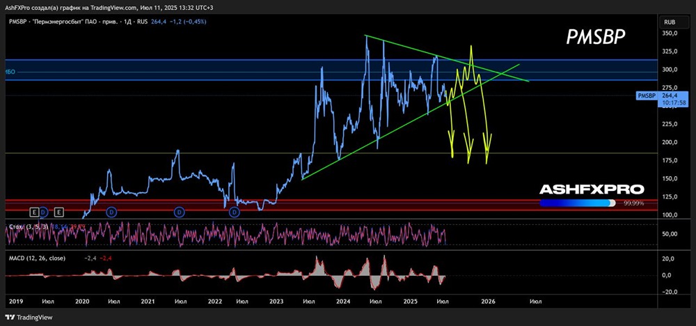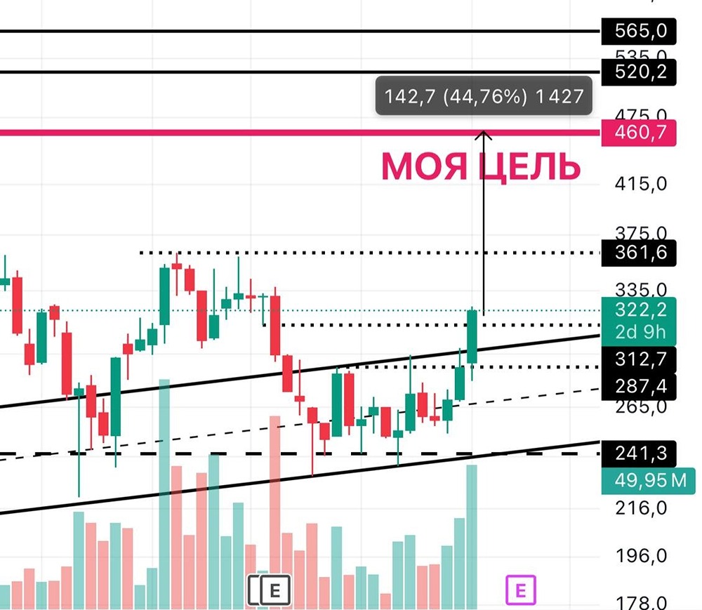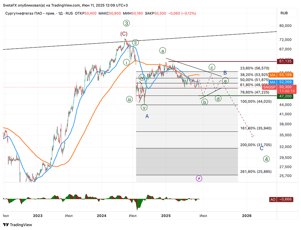 #SNGSP, вероятно, продолжит снижаться и достигнет уровня 47. Если мы правы насчёт разворота рубля, то цена привилегированных акций Сургута станет защитным активом в условиях широкого снижения и девальвации рубля. Это позволит ей откатиться вверх и временно пойти против рынка, продолжив коррекцию в виде треугольника. Данный материал носит информационный характер и не является индивидуальной инвестиционной рекомендацией или предложением о покупке или продаже указанной ценной бумаги.